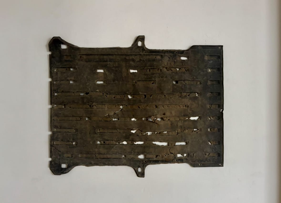 One of the few works still on view in Prototype at Wesbeth Gallery is Ash Moniz’s “[Inaudible]” (2025), a 17-minute video that follows members of Osprey V, a Palestinian rock band from Gaza. Some of the musicians were able to escape to Cairo, while others are still trapped on the strip, relying on intermittent internet connection to share audio files with their fellow band members.