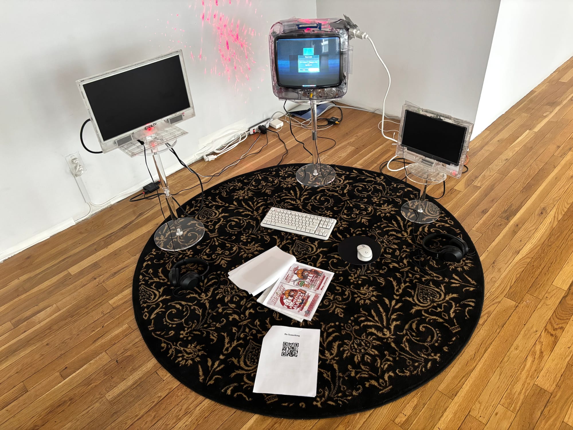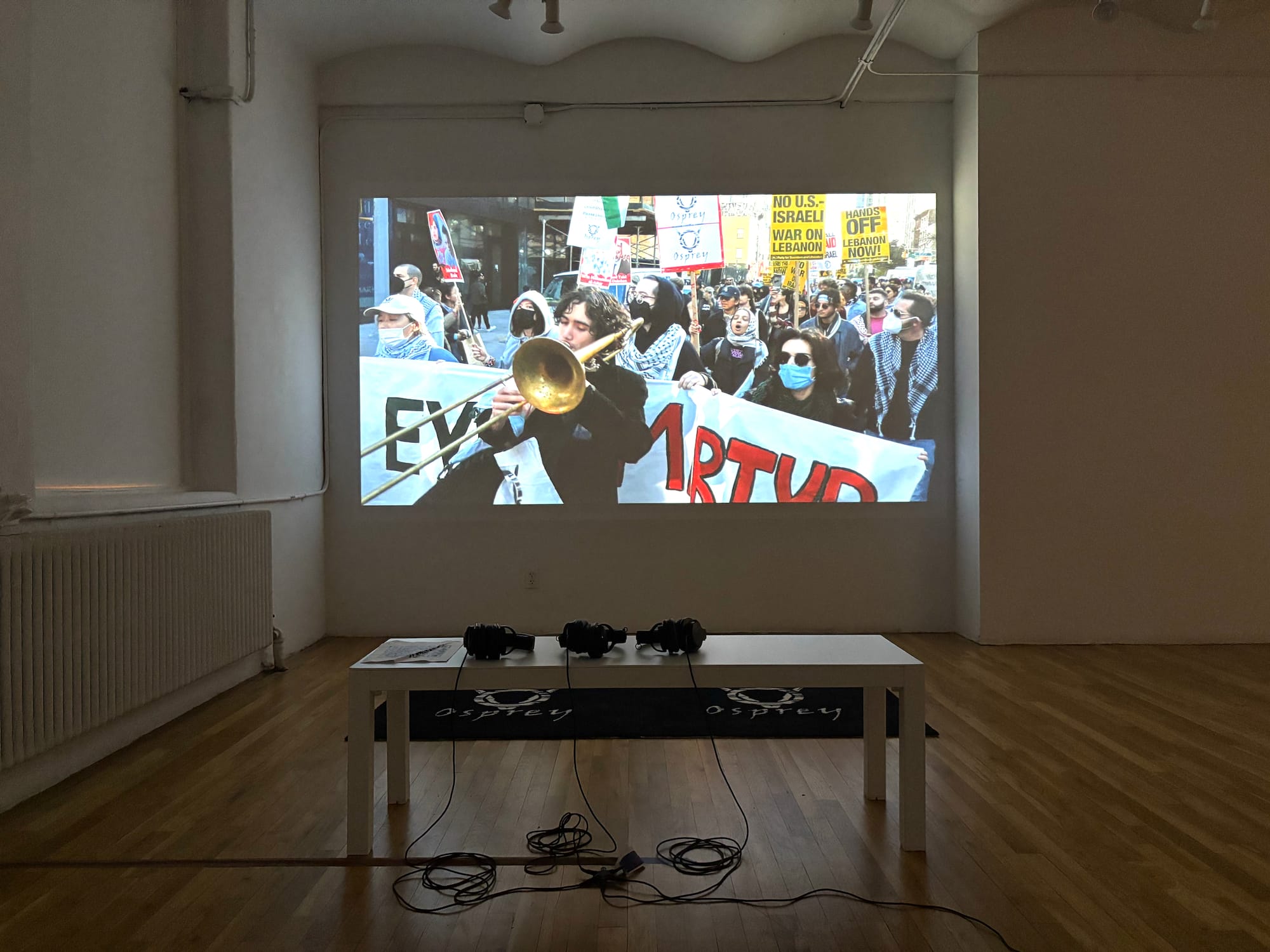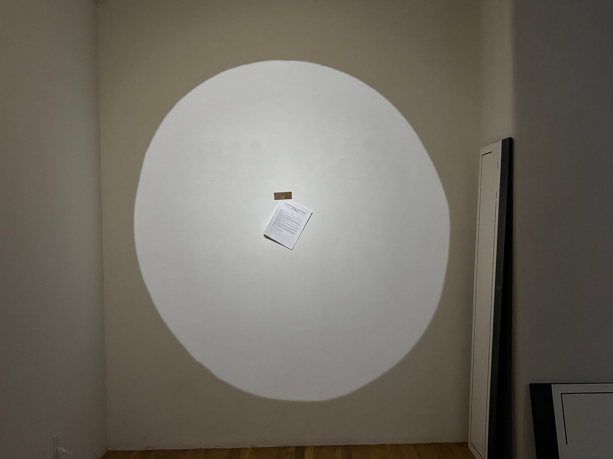 Fellows in the ISP’s three cohorts echoed this sentiment in conversations with Hyperallergic and in public statements published online over the last few days. Along with Nadal-Melsió, who issued a statement today, they have also responded in protest against leadership's decision. Leaflets printed with the cancelled performance scores were strewn across the two exhibitions organized by the fellows at the Westbeth building in Manhattan — a grammar of attention, the Curatorial cohort’s project; and Prototype, the Studio cohort's show. The last page of the packet includes a QR code and the words: "DO SOMETHING." Some artists decided to remove their work altogether, leaving empty space, dark monitors, or a pushed-aside pile of materials where their completed works once stood. And the Critical Studies cohort canceled its symposium, slated to be held yesterday, May 18.
