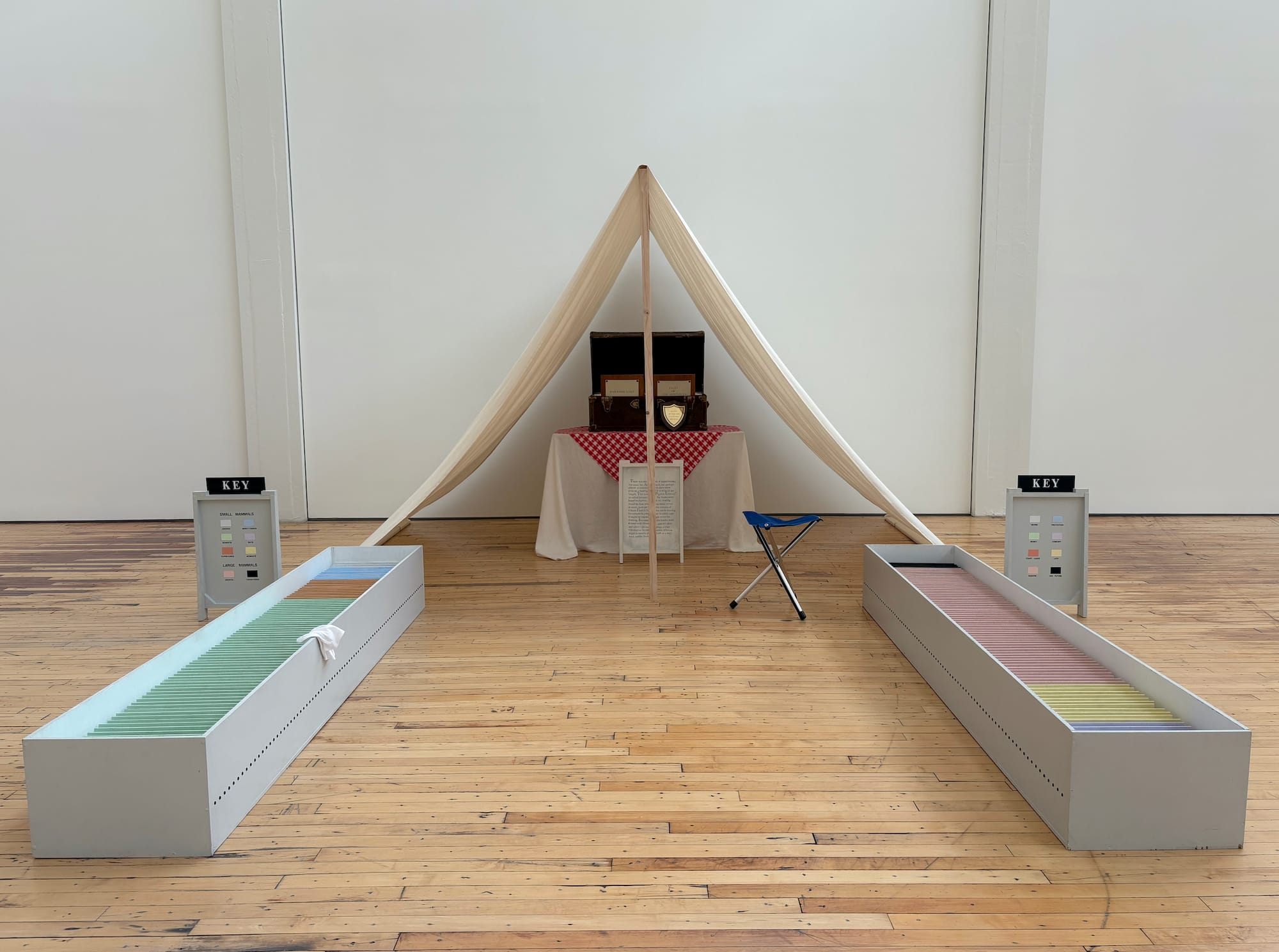 Green’s multicolored Bichos (2025) — modular stations comprised of seven panels each, on view in both halls — are more interactive. Viewers tuck inside and listen to one of her sound scores, such as “ABCDEFGHI” (2000) (in both and English and Spanish), or watch one of her digital films on a monitor, including the 55-minute Elsewhere (2002). Originally created for an outdoor setting at Documenta 11 in Kassel, and later presented at Portikus in Frankfurt, the film is a dreamy exploration of imaginary places and garden architecture. I hesitate to crack into the conversation surrounding Green’s poignant installation “Pigskin Library” (1991), a reconstruction of the book collection that Theodore Roosevelt brought on his journey through East Africa, Congo, and Sudan. You will see this work for yourself and you must read curator Jordan Carter’s insightful comments about it on the Dia website.