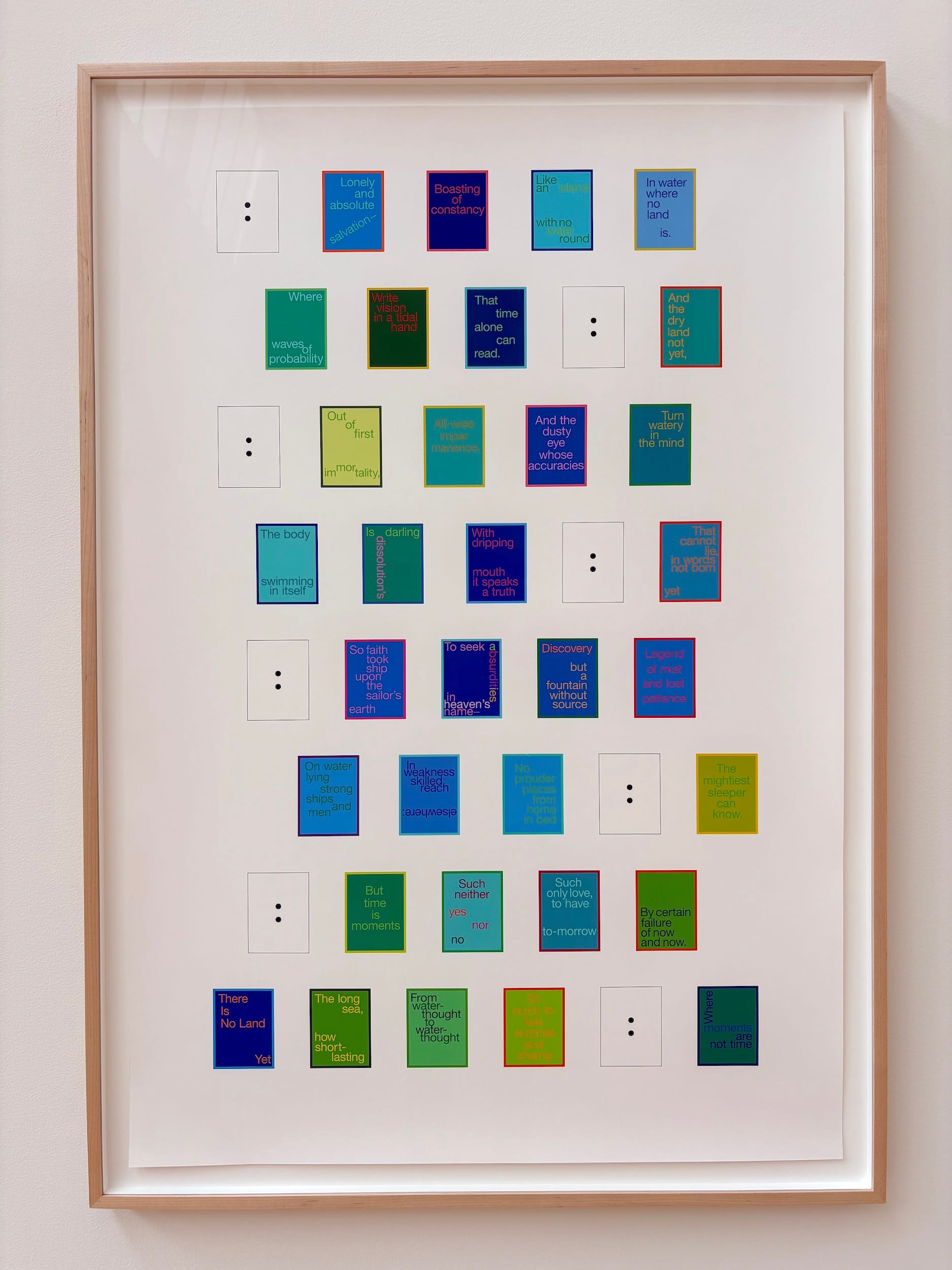 As I ended my journey through Green’s equator-moving presentation, a set of five suspended flags within her installation “Space Poem #14 (Long Poem in Four Parts)” (2024) — a series of multiple banners encompassing writing by Green and others — resounded with the memory of that boozy afternoon at the Whitney a few years ago: “Chosen / Given / Conditions Existing / Failed Attempts / Agency” were the no-nonsense phrases this time around. Once again, Green’s careful attention to the substance of any given moment, or any given meaning, encourages us to determine our own.
