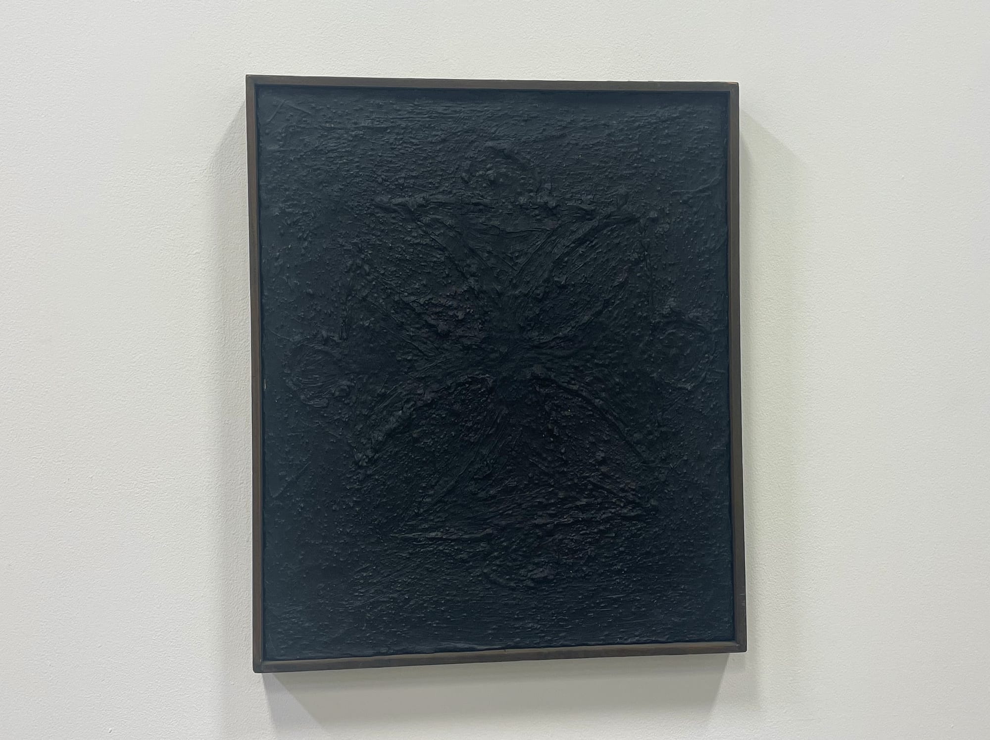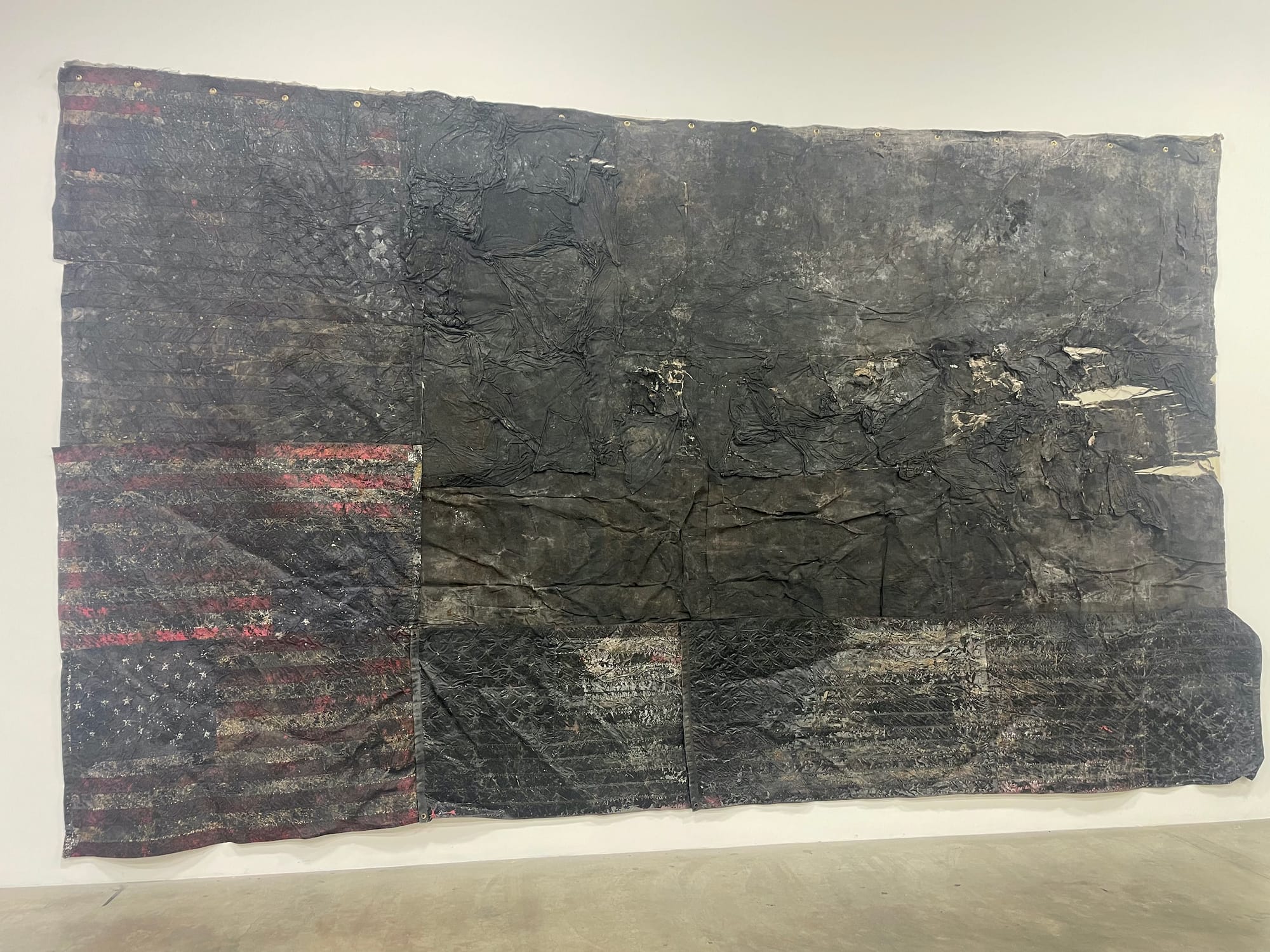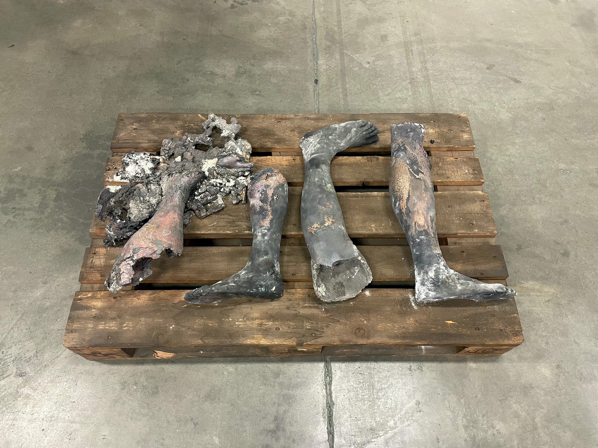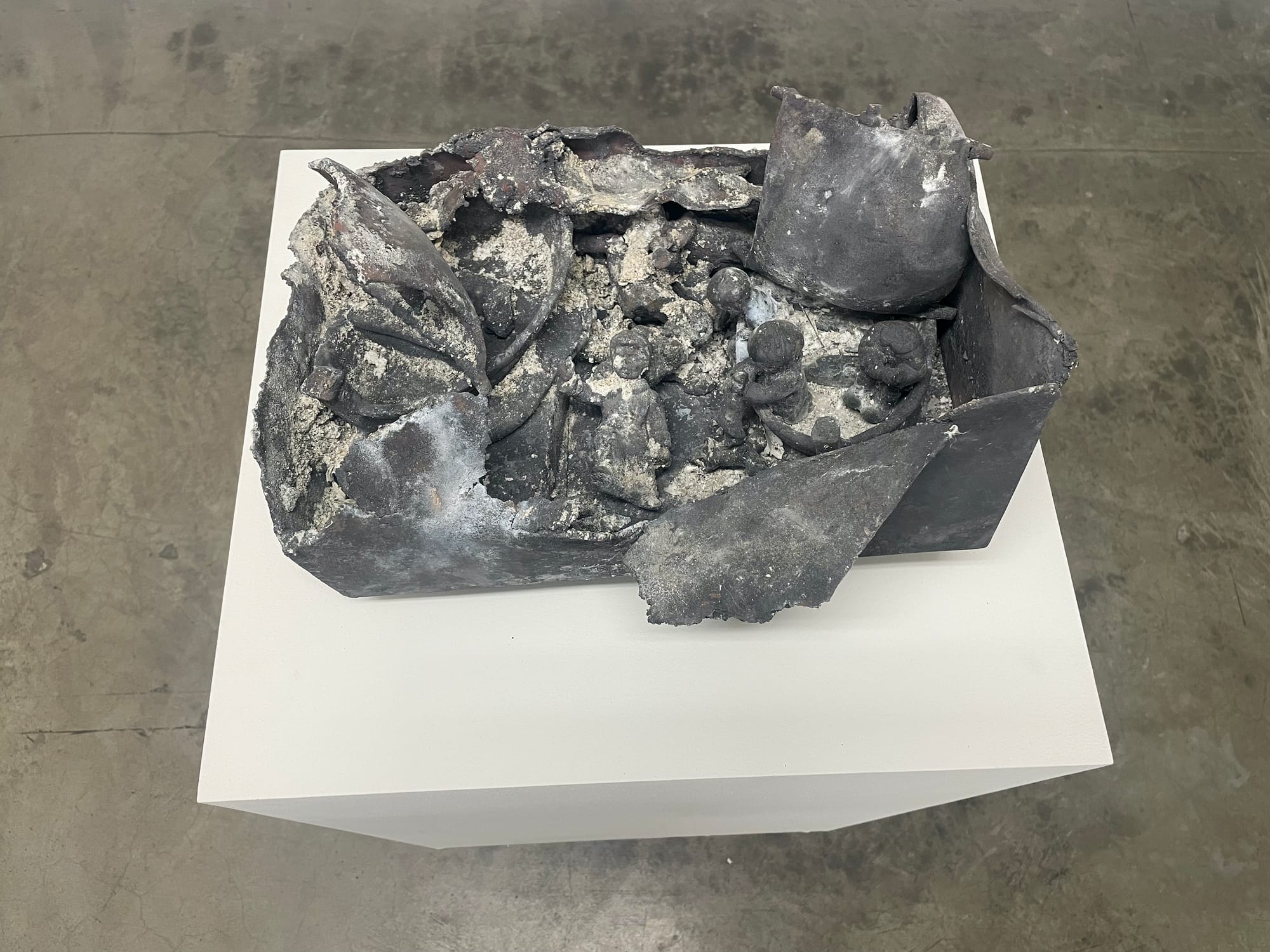 The works in Burn Me! use fire, intentionally or unintentionally, to embody today’s social, political, and environmental struggles. Molly Tierney’s “Eight Flags” (2017–present) is a nearly floor-to-ceiling grid of American flags, their stars and stripes covered in black oil, debris, and dust, a veneer that makes the surface appear burned. This purposeful aesthetic effect (the work was not damaged in the fires) conjures present political sentiment and environmental devastation at once. Elsewhere, Paul McCarthy’s bronze sculpture “Ship of Fools, Ship Adrift, Hummel Box, Affected” (2010/2025) riff on Plato’s “Ship of Fools” parable, which charts the cursed journey of a boat’s dysfunctional crew. Now, McCarthy’s crowd of inept seamen are coated in an ashy crust, surrounded by a bent, fire-damaged hull. The work’s present condition reveals another, contemporary story of poor leadership, its char serving as evidence of inadequate city wildfire preparation and governmental failure to staunch climate change-fueled disasters.
