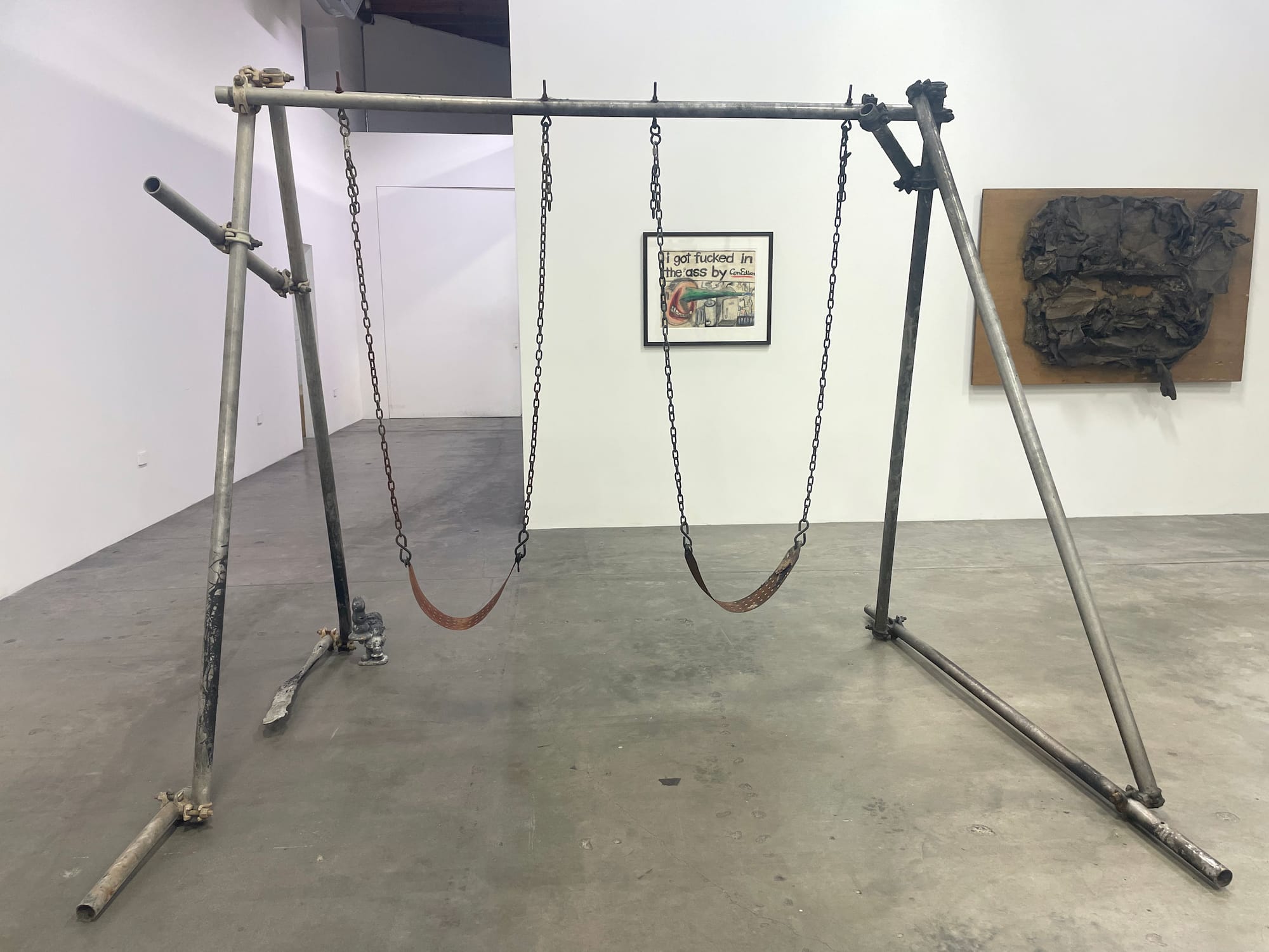 Artworks half-destroyed in January dot the gallery's front rooms, intermingling with sculptures and paintings that examine the intersections between fire and social or environmental change. Jason Rhoades’s “Recession Era Perfect World Park Bench” (2001), previously a replica of an uncomfortable urban park bench, now bears Eaton’s scars: The aluminum tubes that formed its back and seat are now sagging and disjointed at jagged angles, while the L-shaped cinderblocks supporting these bars are singed brown. Similarly, the artist’s “Perfect World Swing Set” (2000–2001), a simple playground structure, looks like a post-apocalyptic relic, its black patina evoking suburban decline. For his Perfect World project, first installed in Hamburg in 1999, Rhoades placed a pristine replica of a complete town on an elevated Plexiglas platform supported by precarious, disorderly aluminum scaffolding, which he compared to a “Garden of Eden” lofted over “Hell.” The damaged artwork eerily reflects this statement.