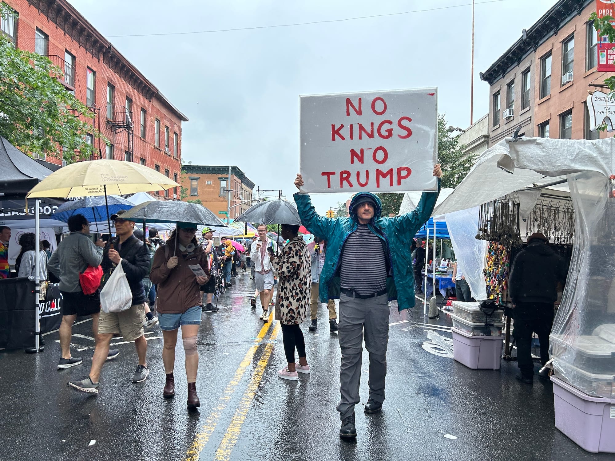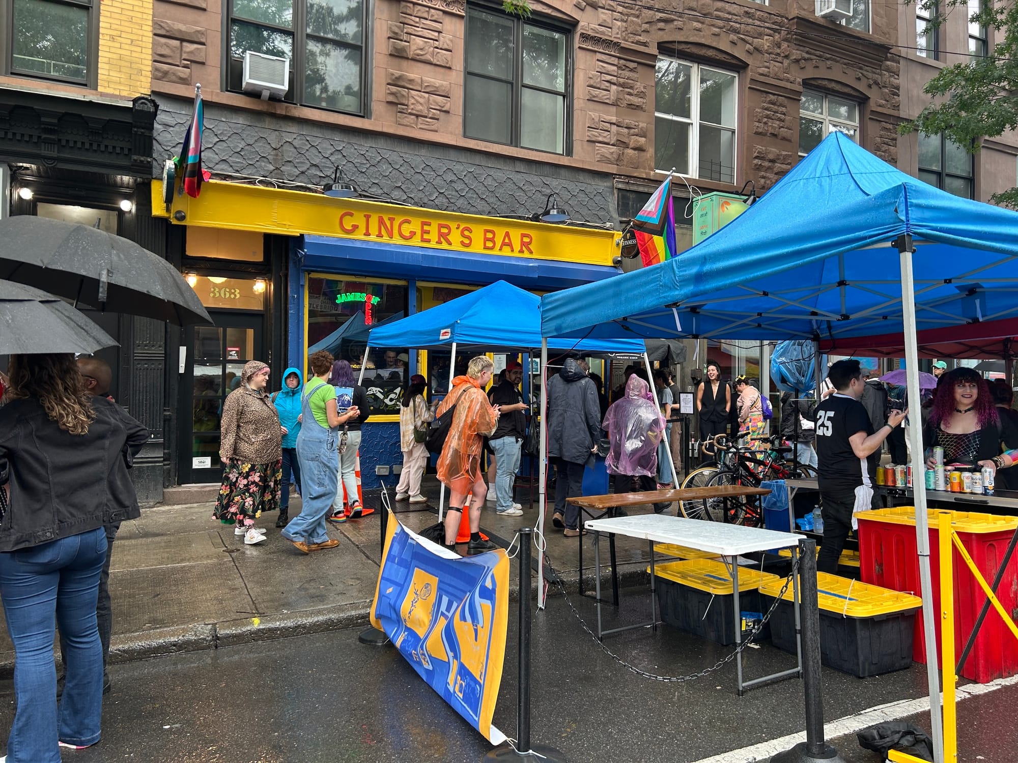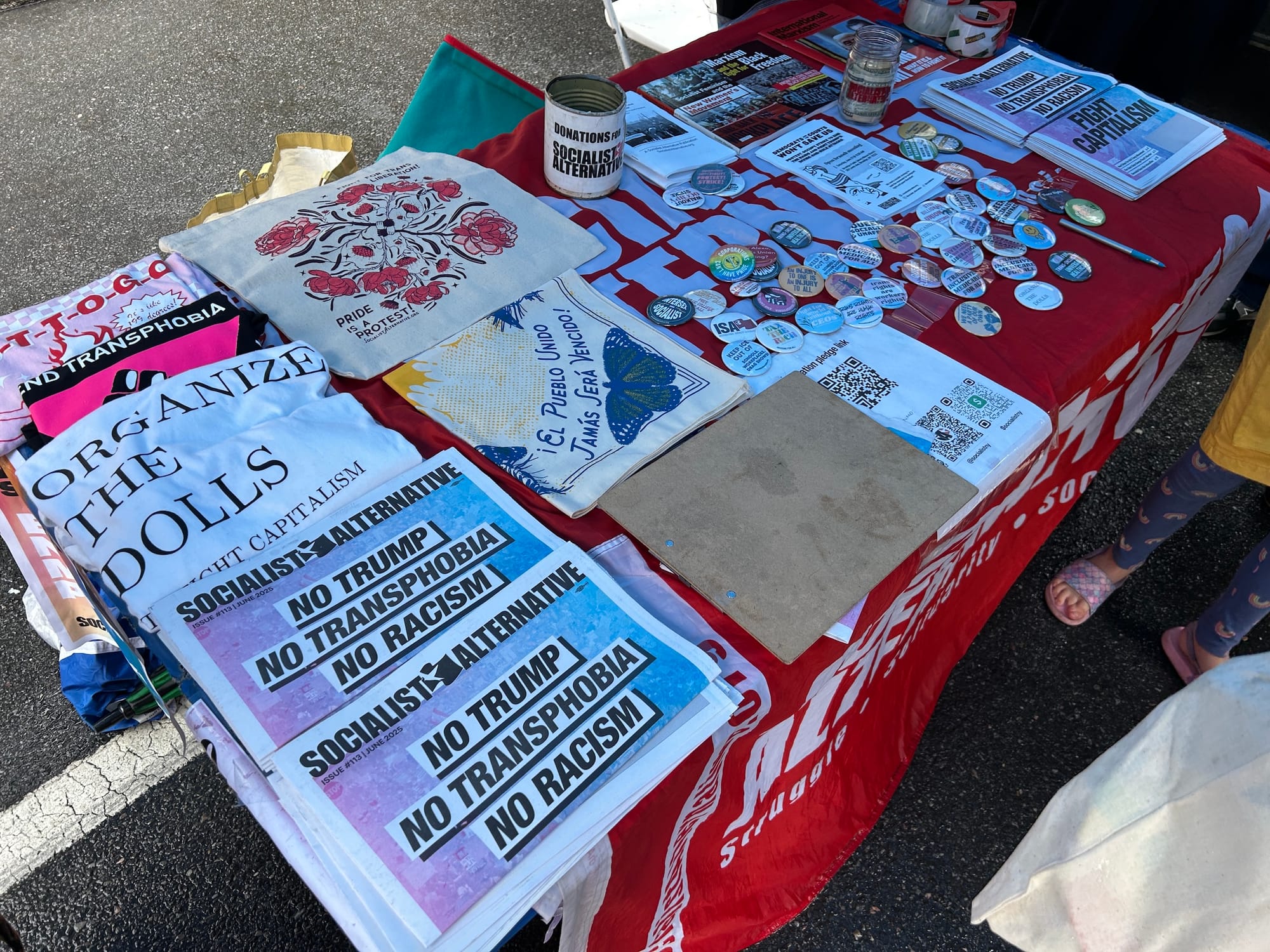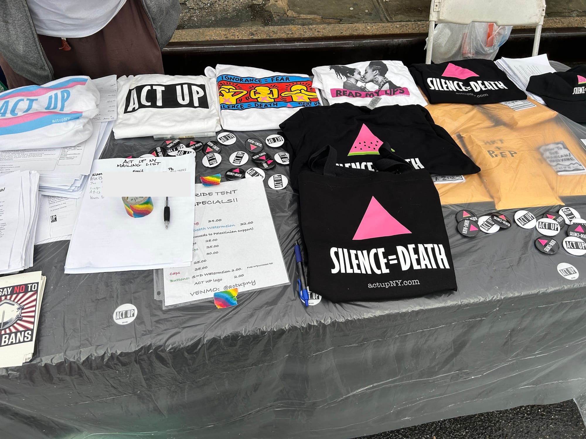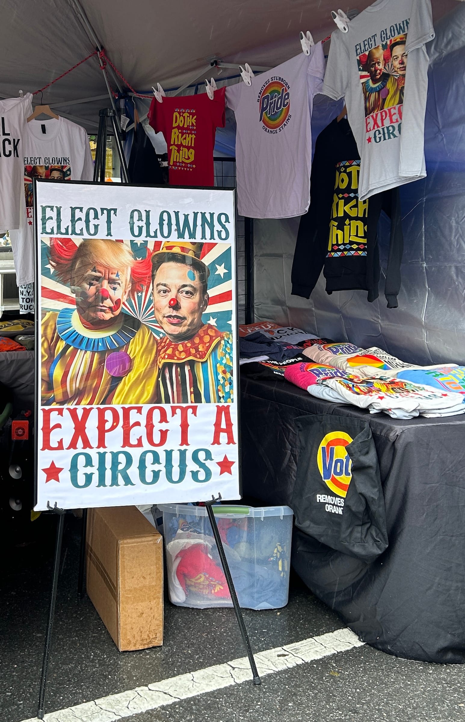 While rainbow-washed corporate marketing gimmicks could be seen across the festival, local organizations and activist groups also took the opportunity to educate, protest, and fundraise. In the middle of the rainy street, a Health Department worker distributed free condoms to raise awareness about sexual health. At a table near a performance stage, Socialist Alternative members sold buttons, broadsides, and apparel decrying Trump’s attacks on trans communities. Other booths sold posters comparing Trump and Elon Musk to clowns and displayed signs opposing disgraced former governor and current mayoral candidate Andrew Cuomo.