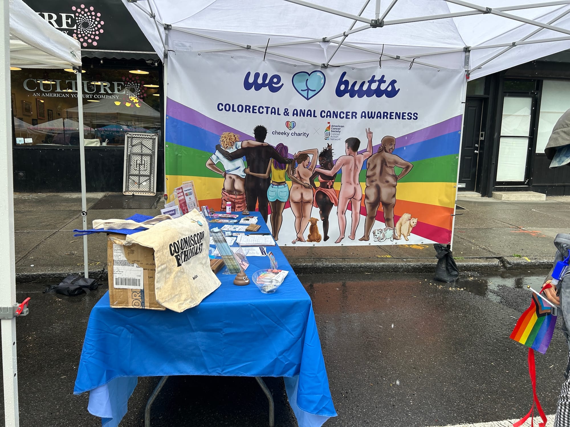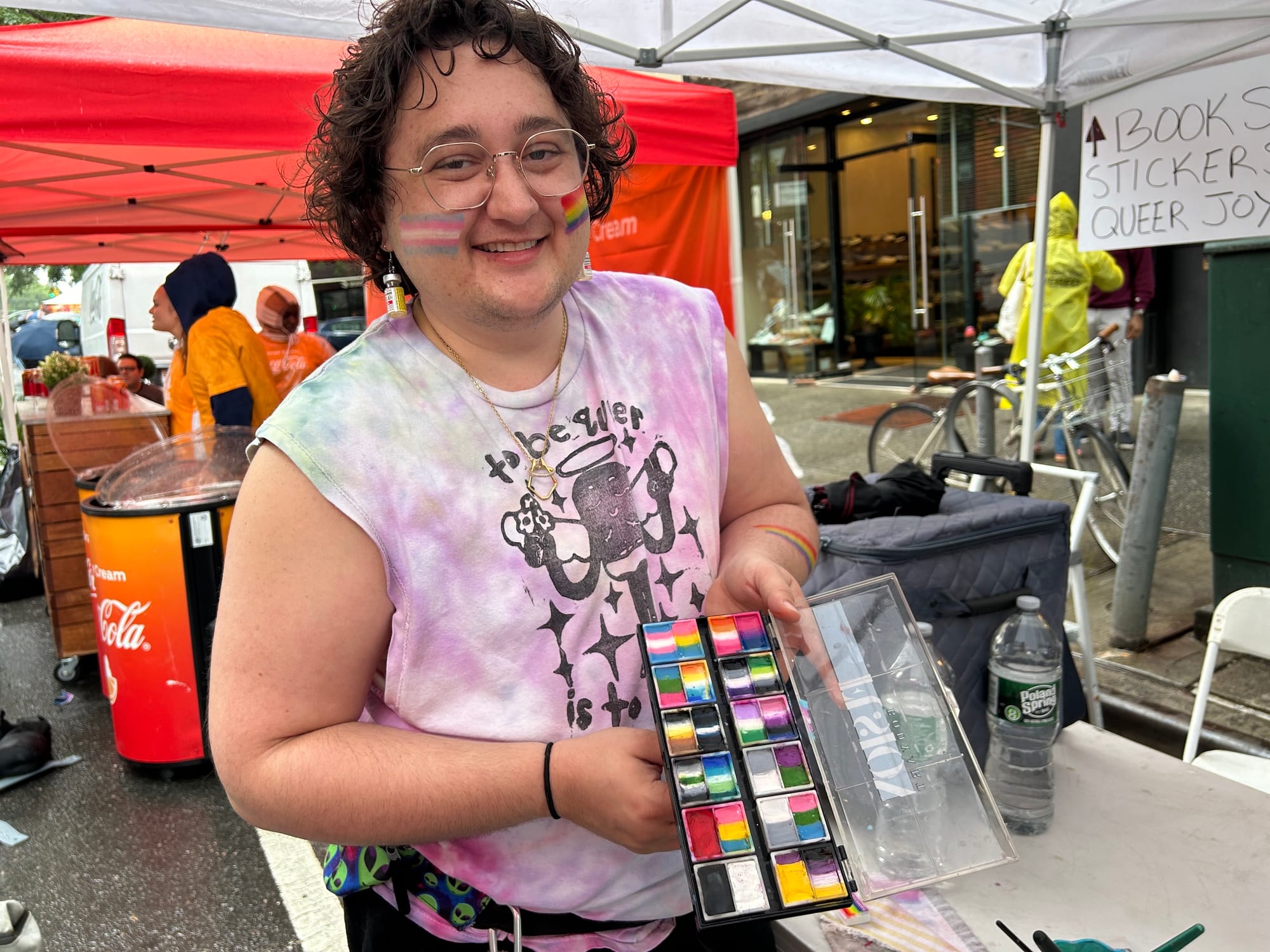 In front of the Ripped Bodice bookstore, Queens-based trans artist Ash Craig set up an impromptu Pride-themed face-painting stand, offering his services to festival attendees for free. He had decided only last minute to attend, as he was unsure if the weather would hold.