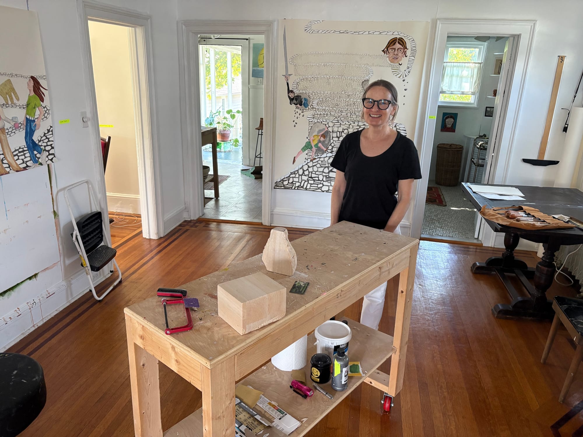 My next stop was Ann Bridget Murphy’s open studio in Catskill, one of the most charming towns around. Murphy warmly welcomed me into her home, and we chatted in her living room-turned-studio, where surrealist-style portraits and eccentric drawings of figures and lone faces holding swords occupied every wall.
