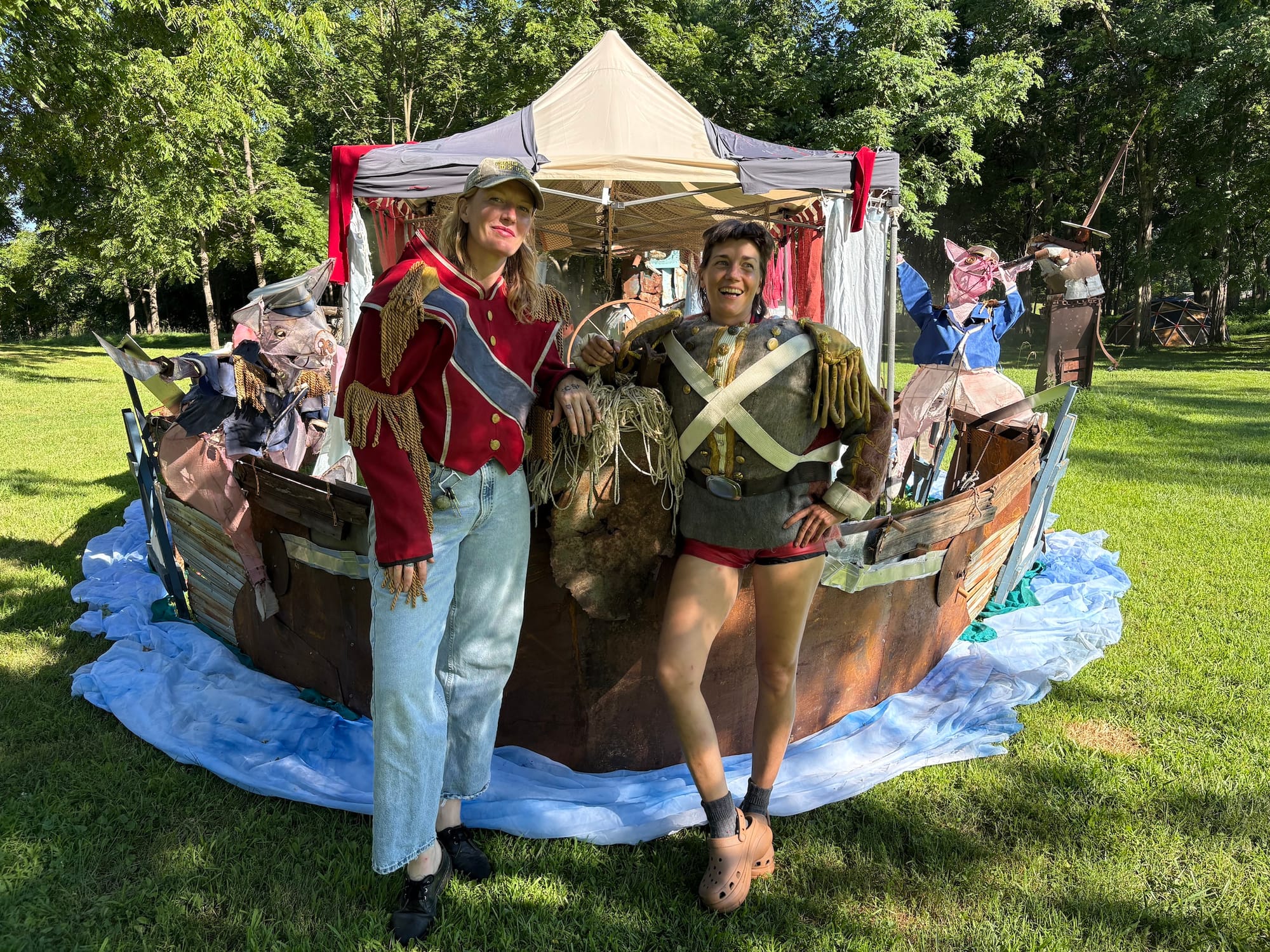 A highlight was seeing Z Behl and Kim Moloney (a collaborative artist-duo known as Baloney) and their site-specific installation WITHDRAWN: Thatcher and Snatcher and Imperial Slop (2025). Working with scrap metal and locally sourced materials, the artists created a monumental sculpture of a boat with accompanying fabric sculptures of pigs in sailor outfits and a misty spray of water, administered from above and softly cascading down in a refreshing gust to make visitors feel as if we were at sea. Rooted in the conceptual framework of The Tin-Pot Foreign General and the Old Iron Woman (1984), a banned children's book by British author Raymond Briggs, their allegorical sculpture comments on historical violence and policing, cast-off narratives, and gendered nationalism.