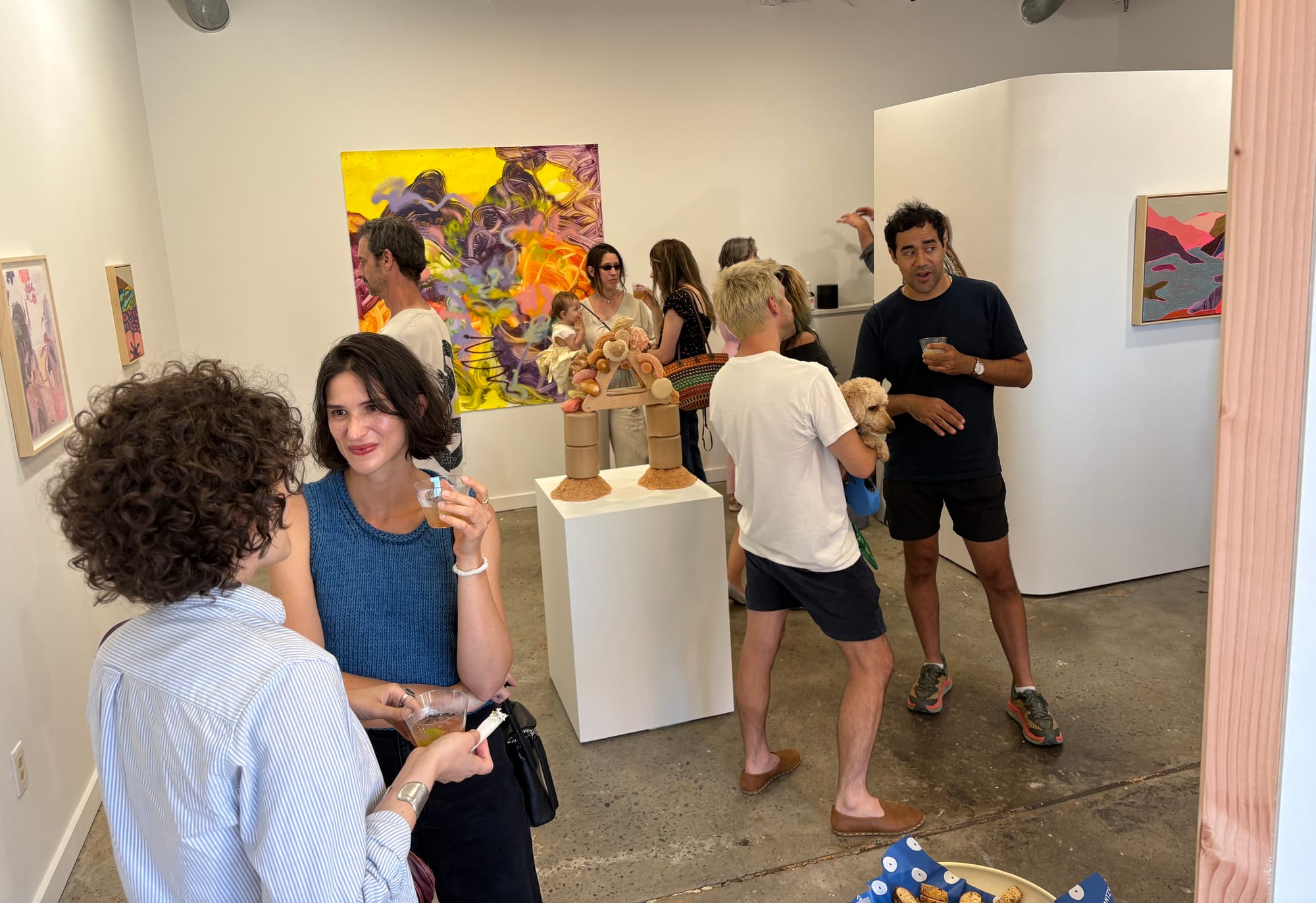 With a glorious summer sunset infusing the scene, I finished out Friday at Cut Teeth in Kingston to see the seven-artist exhibition EARTHLY / Otherworldy, which the gallery’s description explains is aimed at “exploring the intersection of the natural and the supernatural.” I chatted with Caroline Burdett, local artist and curator of the show, as a buoyant crowd milled about.