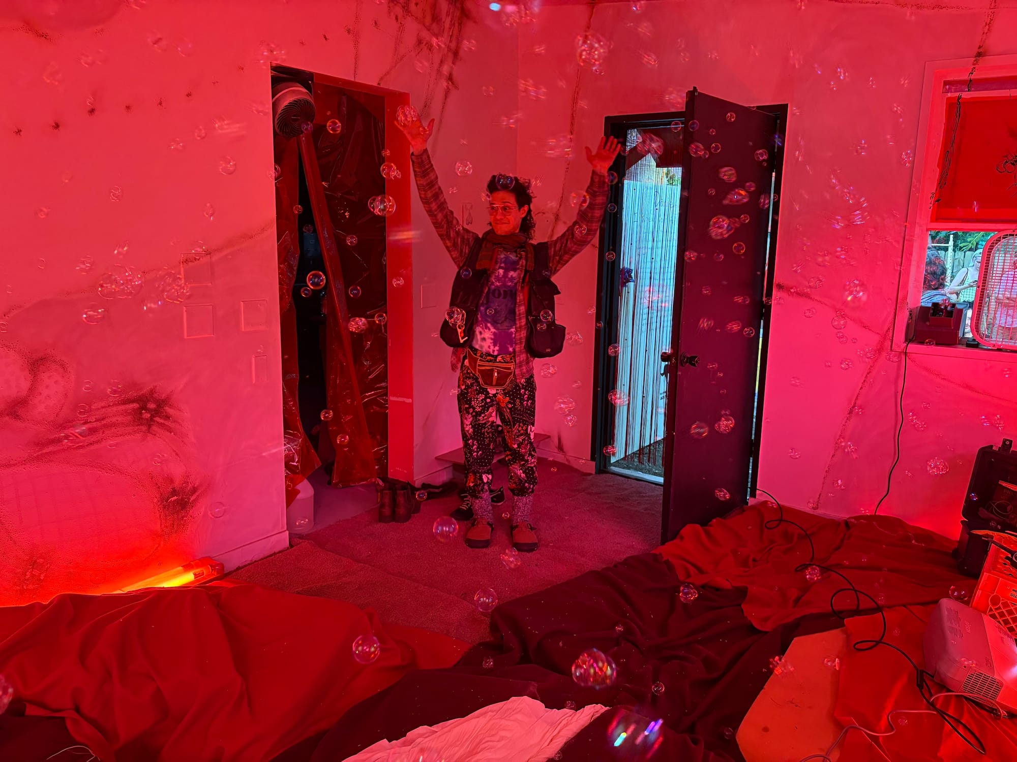 Among the most wonderfully outrageous things I encountered all weekend was the site-specific installation “Daniel Giordano: I Knew Your Father When He Had Cojones” (2025) at the Green Lodge in Chatham, where I attended the Saturday evening opening amid a fun-loving crowd. Located in the back of a rural home, this small experimental space is run by curator Owen Barensfeld. For this show, Giordano took over the gallery room and infused it with red lighting and haphazardly burned lines across the ceiling and down the walls, with additional drawings on plastic sheeting and puffy sculptural fabric on the floor, inviting viewers to take off their shoes and get into the piece.