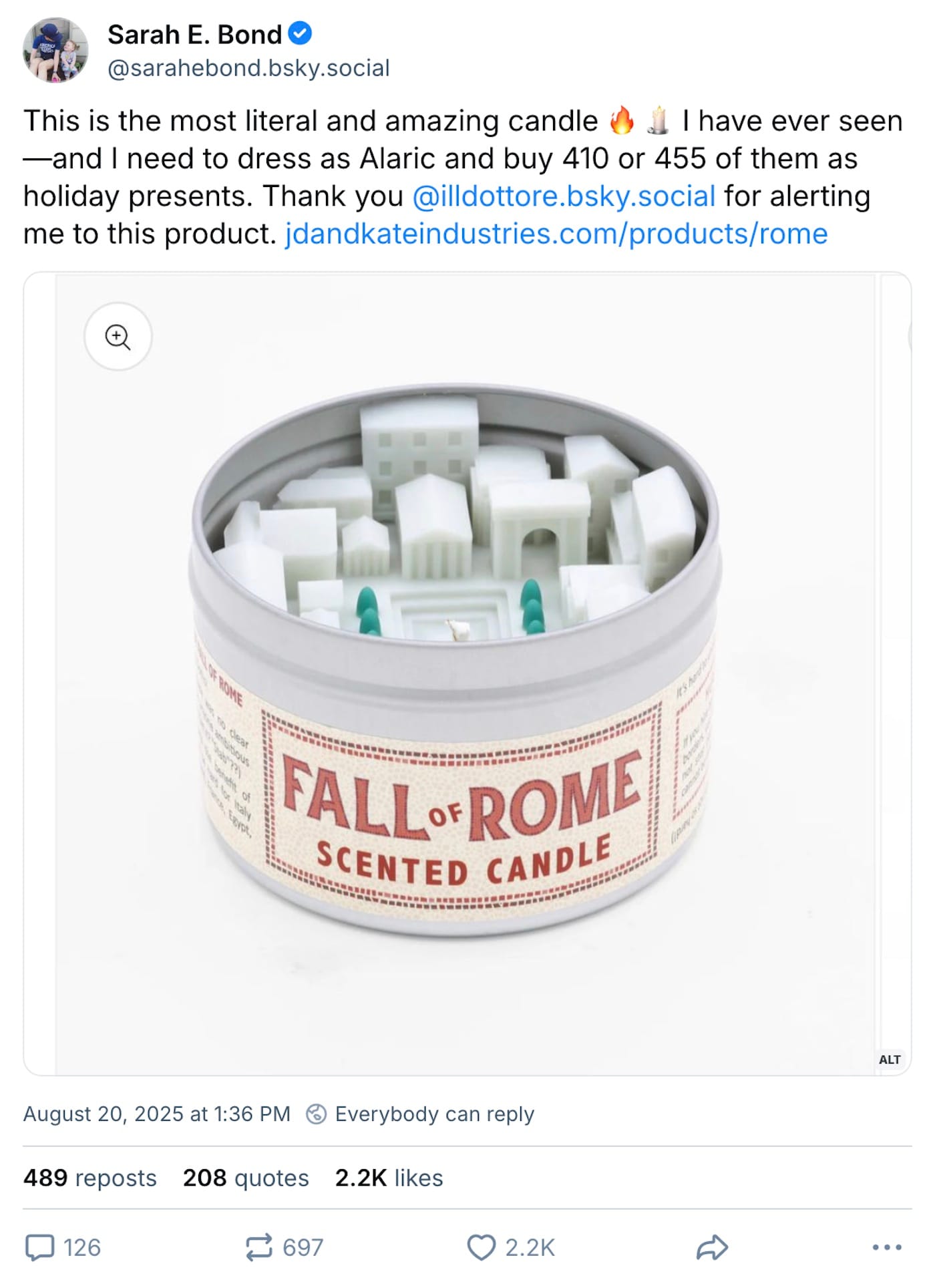 ‣ Speaking of fall, what better way to ring in the season than with a "Fall of Rome" candle? Historian and Hyperallergic contributor Sarah E. Bond puts us on: