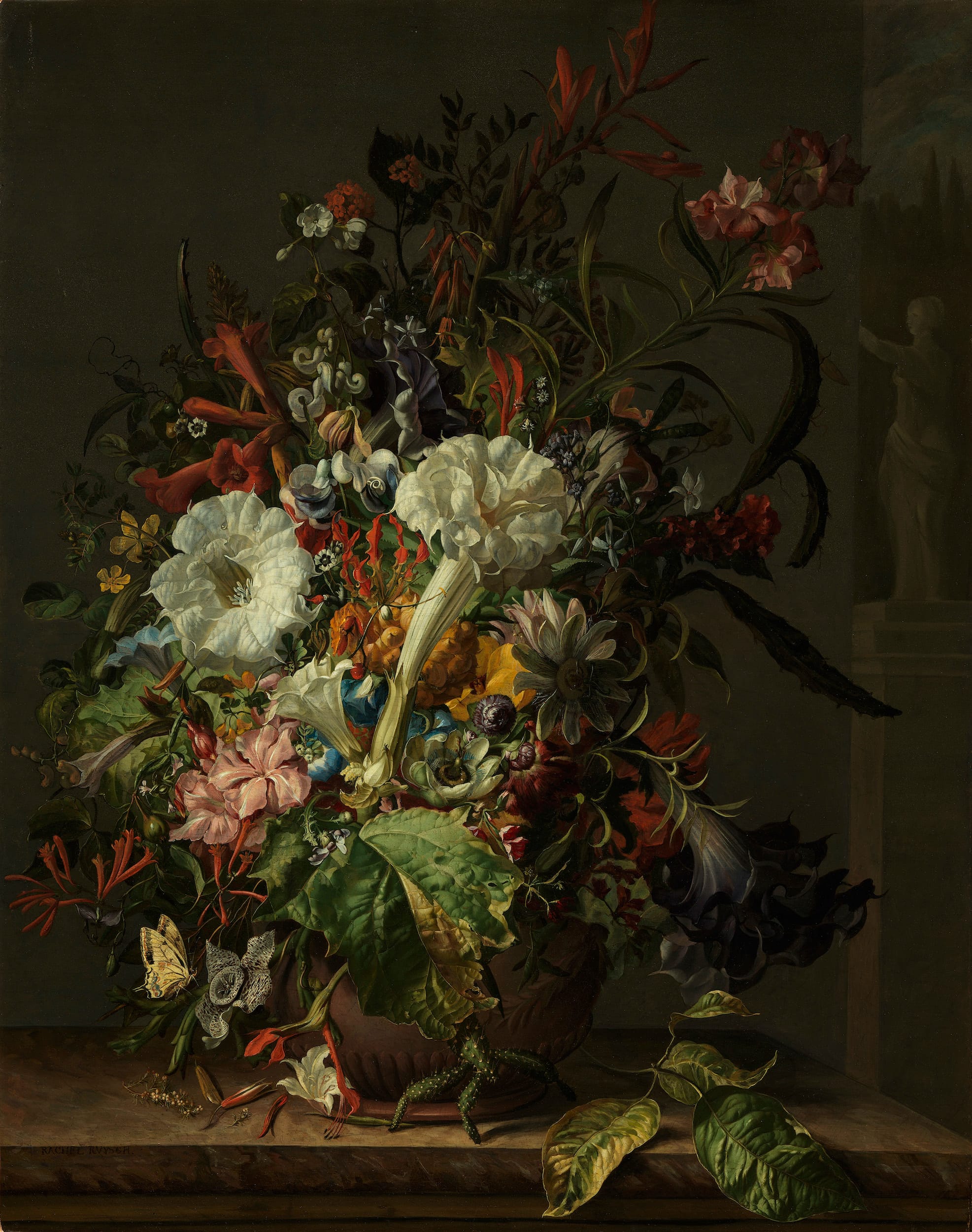 The paintings of Rachel Ruysch (1664–1750), now on view in Artist, Naturalist, and Pioneer at the Museum of Fine Arts, tap into the power of flowers. Through scores of paintings across four rooms, almost all of bouquets, the viewer can luxuriate in floral abundance and variety, all sharpened by an acute awareness of death, decay, and the violence of nature. The artist rarely depicted flowers alone; these bouquets buzz with insects and spiders while hungry amphibians and combative lizards crawl beneath. To underscore the scientific accuracy of her portrayals, the installation includes numerous natural specimens floating in jars and pinned in boxes, courtesy of the Harvard Museum of Comparative Zoology.