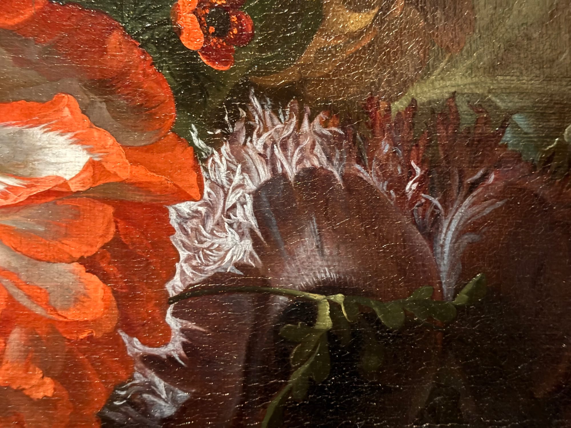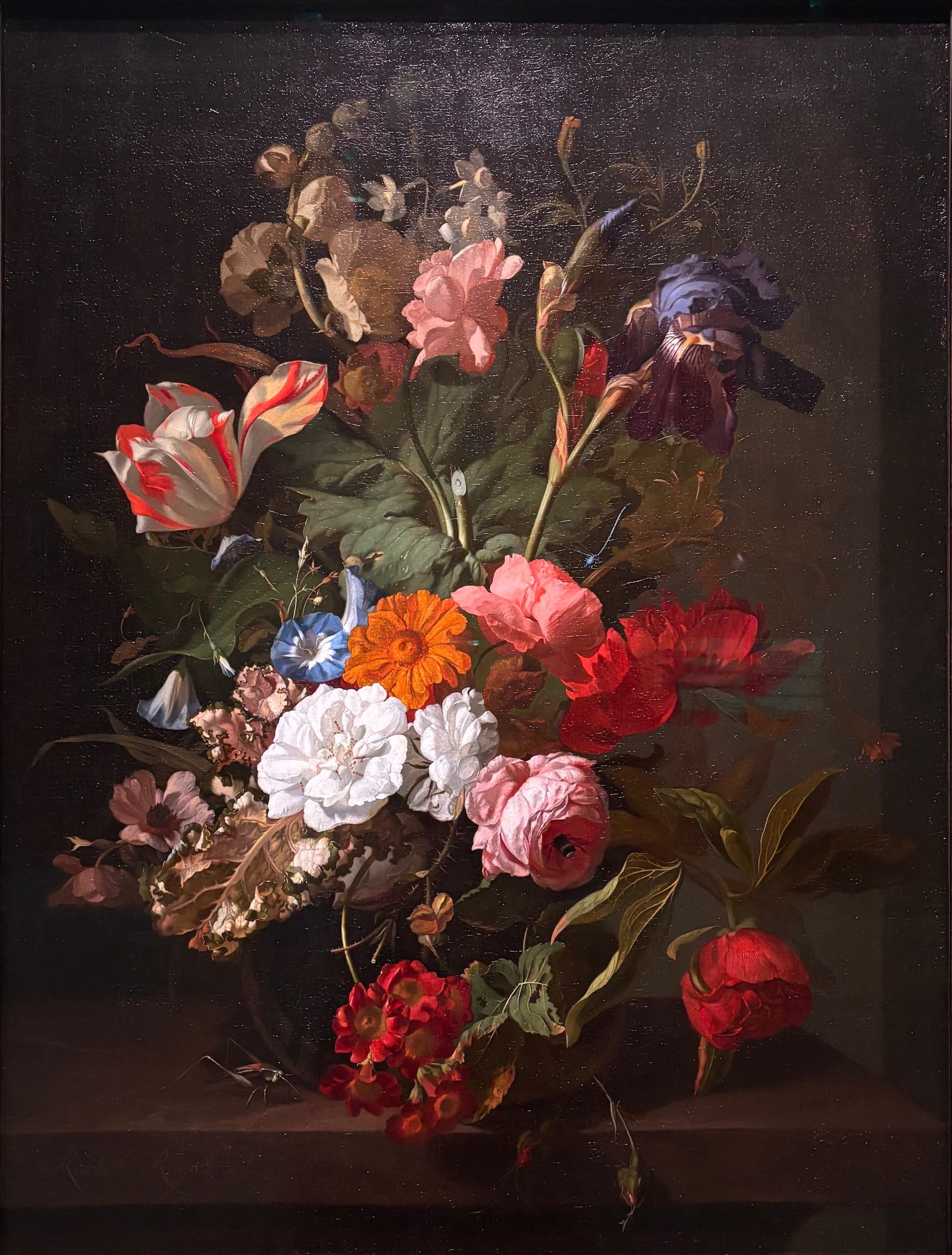 Ruysch encourages the sense that audiences can very nearly obtain this immersion themselves. As her career progressed, her overall compositions often moved toward disorienting abundance. Rejecting the airier, leafier style of Van Aelst’s work, she snuggles her flowers together as intricately as puzzle pieces. As such, the ideal viewing distance is about 18 inches. From this perspective, you can mull over the painting’s details and sup like an insect from each flower’s beauty, as in the Toledo Museum’s “Flower Still Life” (c. 1716–20).