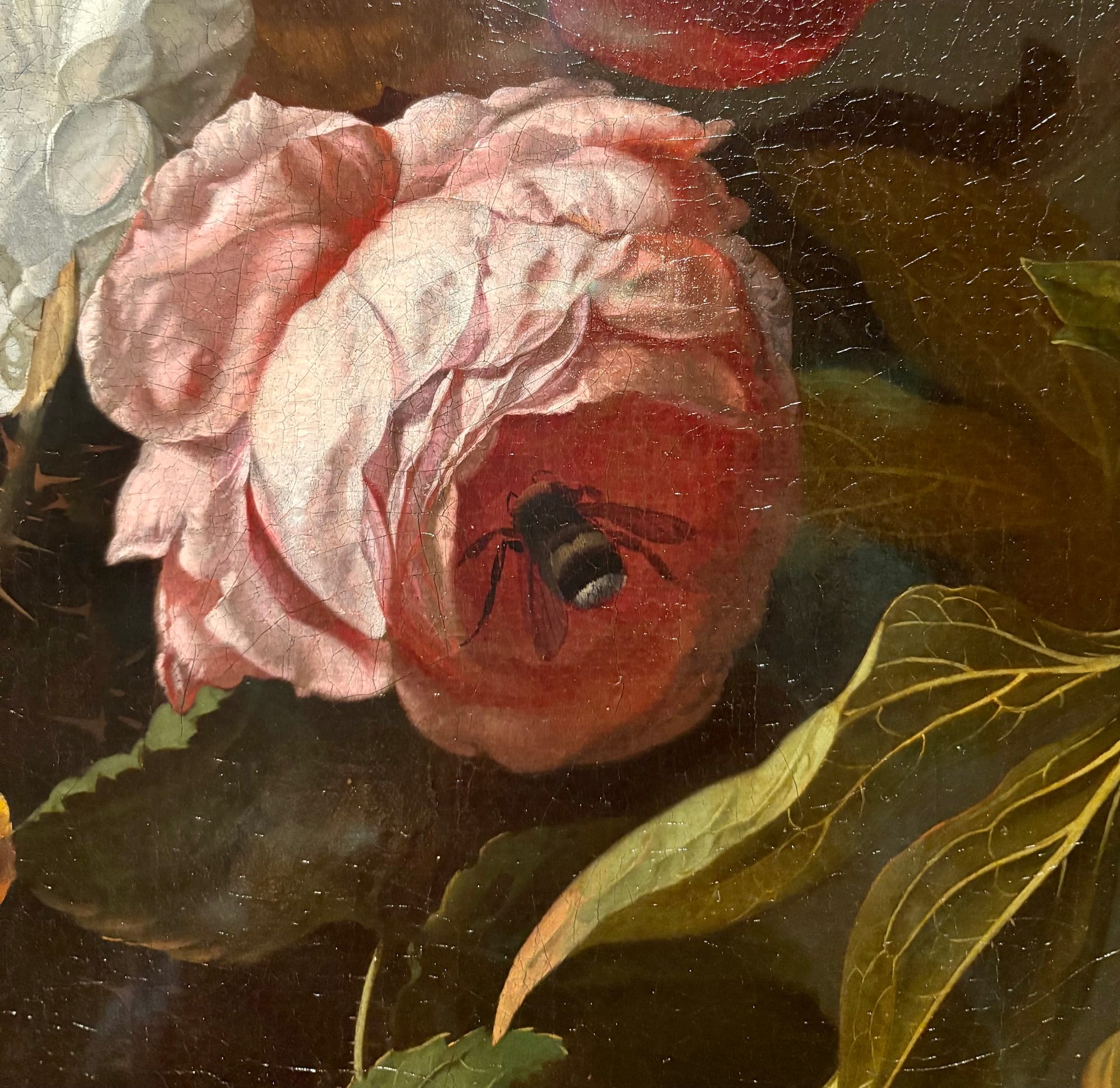 Ruysch continued painting into her 80s, the canvases smaller and less intricate than before but no less adoring of the precise structure of the flowers and insects she depicted. A diva of a pink rose dominates “Posy of Flowers” (1741), its petals strewn with drops of water. It sits on a stone ledge surrounded by a tangle of smaller flowers and attended by a bee. A longhorn beetle poses elegantly to the left, its striped antennae aloft. The stem of the rose, thickly furred with thorns, protrudes toward us, daring us to grasp it. A bud of the same flower bends backward, its sepals a calligraphic twirl of green and yellow. Mingled with these, Ruysch has used the same pigments to paint her name on the facing surface of the ledge. Honor the flower painter, for she has been face-to-face with the very matter of life.