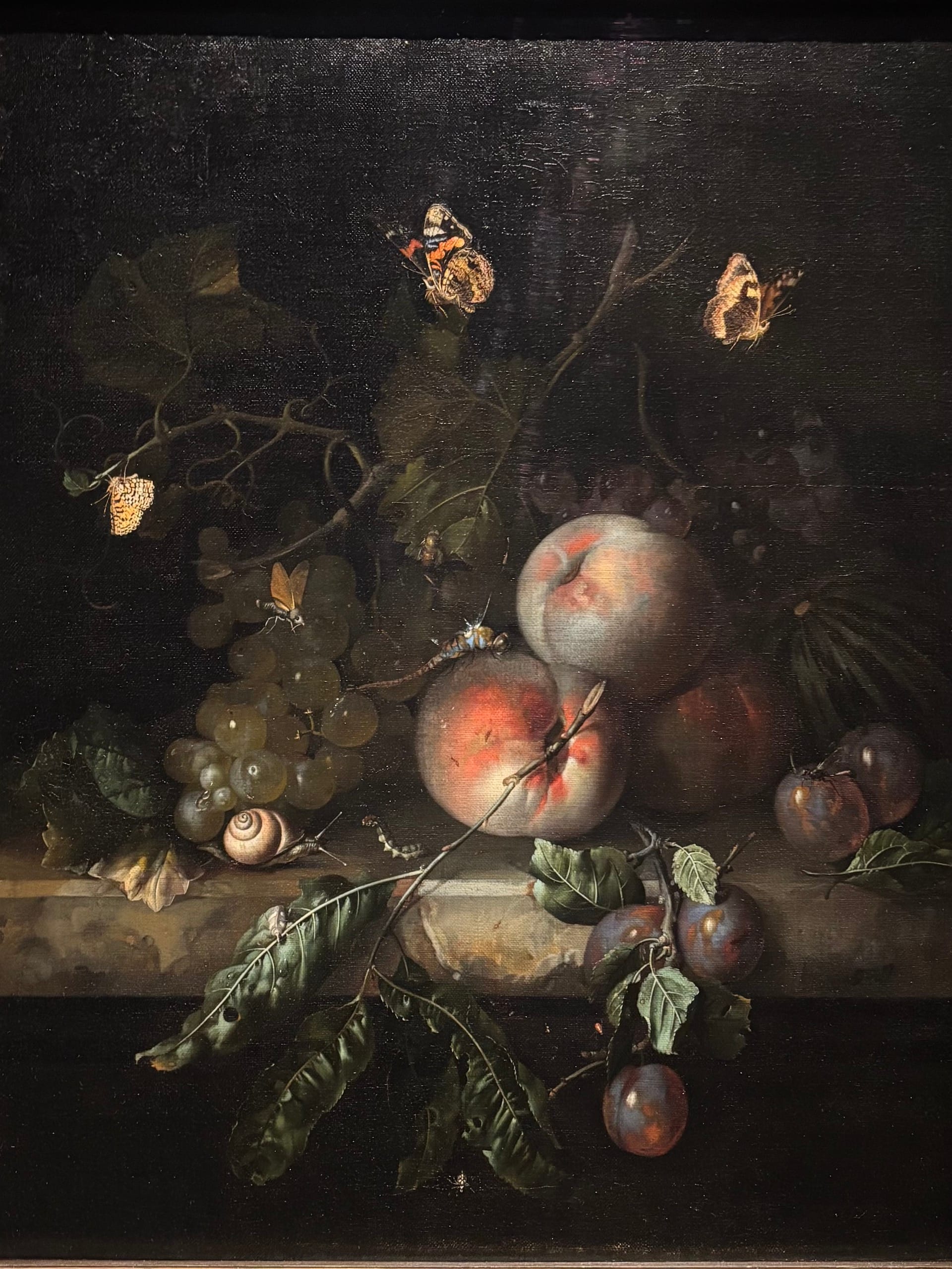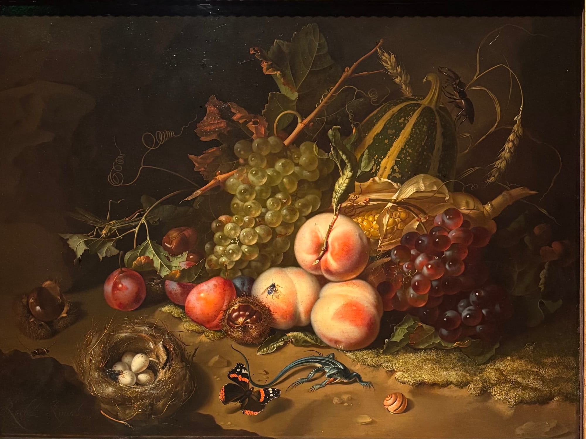 Around 1708, Johann Wilhelm, Elector Palatine in Düsseldorf, made Ruysch his court painter. She served in this position of honor largely from a distance, regularly dispatching completed paintings. He gifted two of them to his father-in-law, Cosimo III de’ Medici, the grand duke of Tuscany, but kept the best one for himself: Ruysch’s largest painting, at about four feet wide. Its modern title, “Still Life with Fruit and Flowers,” is a laughable understatement. A stone ledge supporting a basket of flowers and a distant view of a misty copse provide minimal organization to the composition. But it also burgeons with peaches, pomegranates, plums, red and green grapes, hazelnuts, white mulberries, an ear of corn, blackberries, and three vaguely ominous melons, one whose skin has ruptured to reveal its pink flesh. As for flowers, there are many, as well as butterflies, moths, ants, bees, beetles, spiders, caterpillars, snails, lizards, a grasshopper, a dragonfly, and a bird sitting in a nest. Did the Elector Palatine have time for much else besides looking at it?
