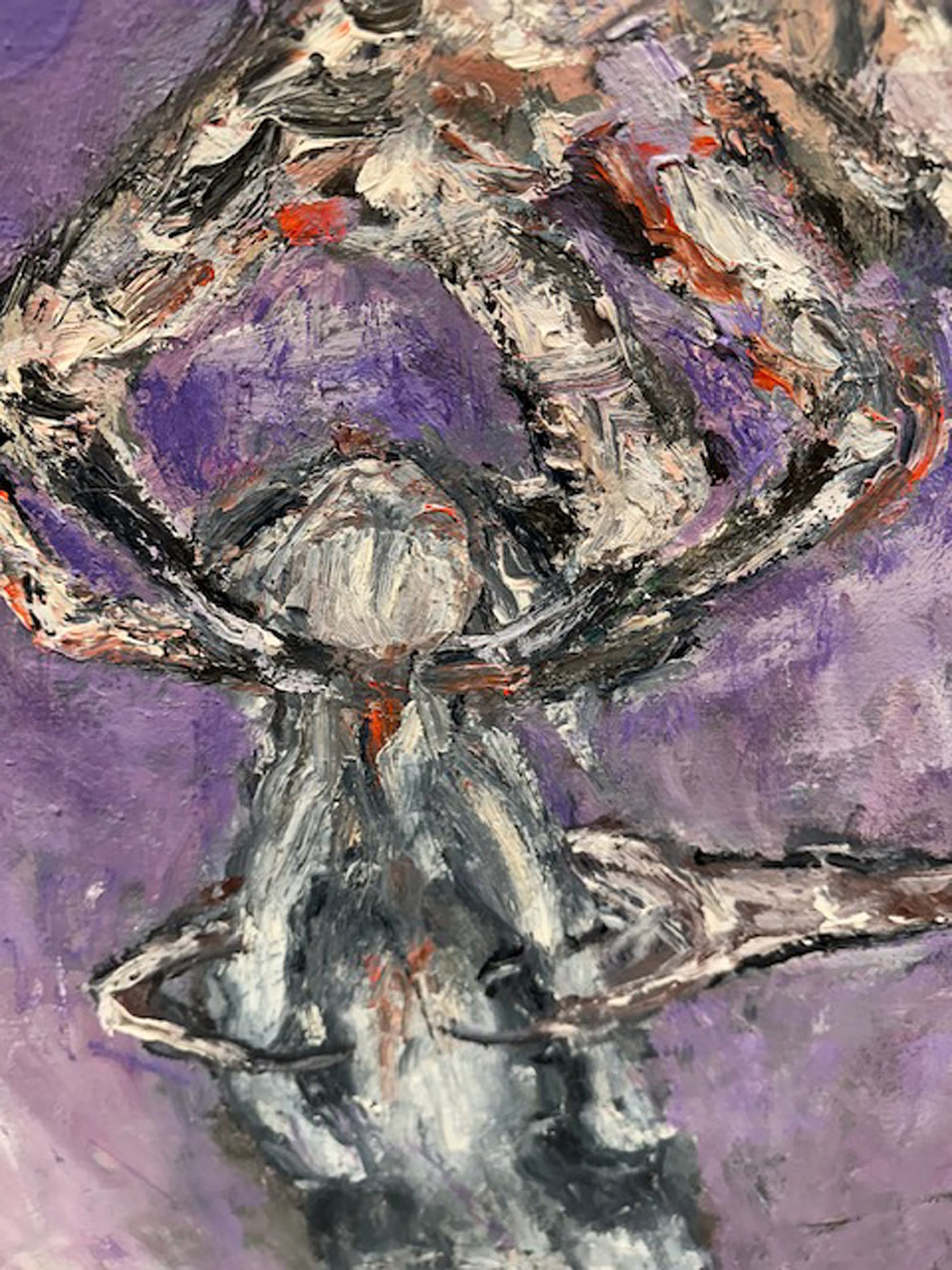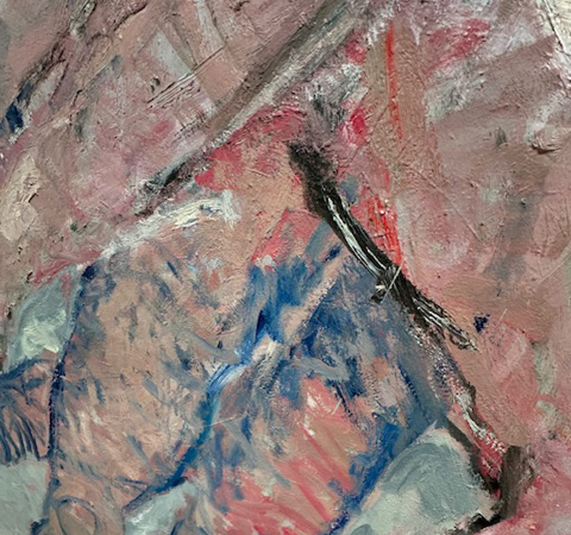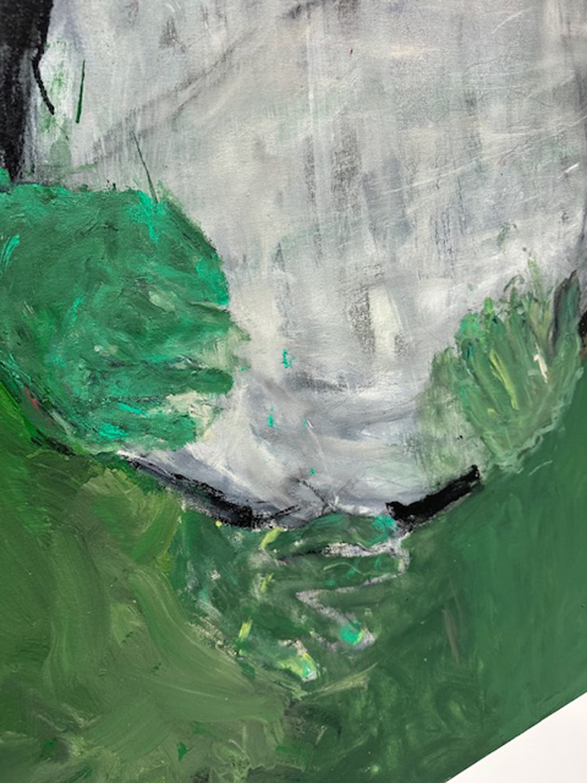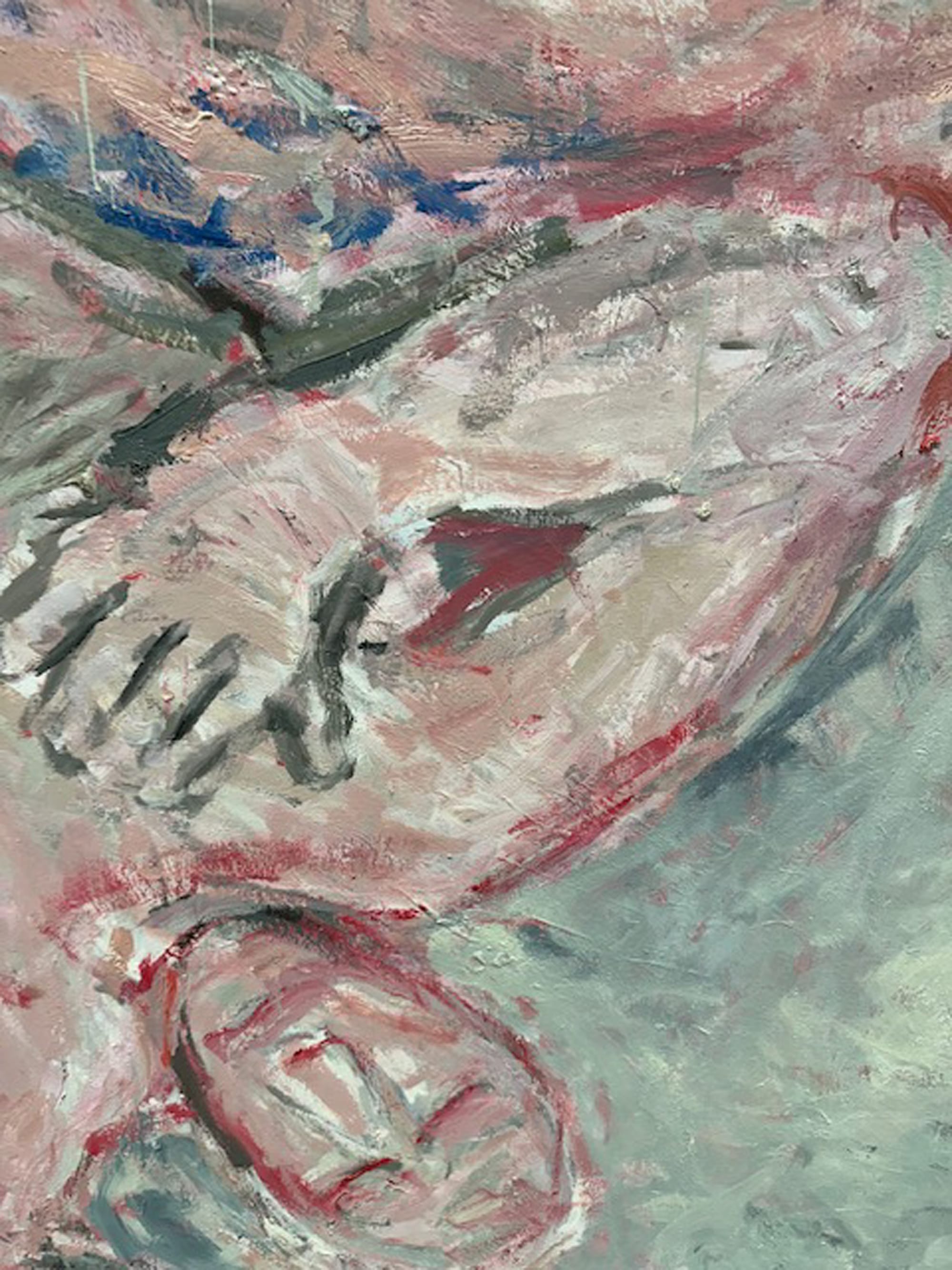 The yield of Rothenberg's continuous and steady growth — even in her last years — is most fully seen in the final room of the exhibition. In “Las Blancas” (1996–97), “All Night Long” (2000–01), “Lift Off” (2006), and “Untitled (Band and Hands Green)” (2018), the artist tenderly portrays bodies in a state of vulnerability — often seemingly nude or contorted — as if they are not quite comfortable or settled in their space. These potent and provocative paintings of her last 25 years or so exude a particular anguish, but also an agility in her markmaking. “Untitled,” with its birdseye view of a head in two hands, echoes the overhead, omniscient view of the yoked cranium in “Red Head.” But in “Untitled,” a sense of emotional transformation is more subtly communicated via the slow, brushstroke-by-brushstroke evolution of the green from light verdant to dark evergreen, or the gray peeking through the bonewhite head. Rothenberg was certainly a skilled painter — but more than that, she was one who continuously sharpened that skill through repetition to better articulate sentiments at once everyday and exquisite.