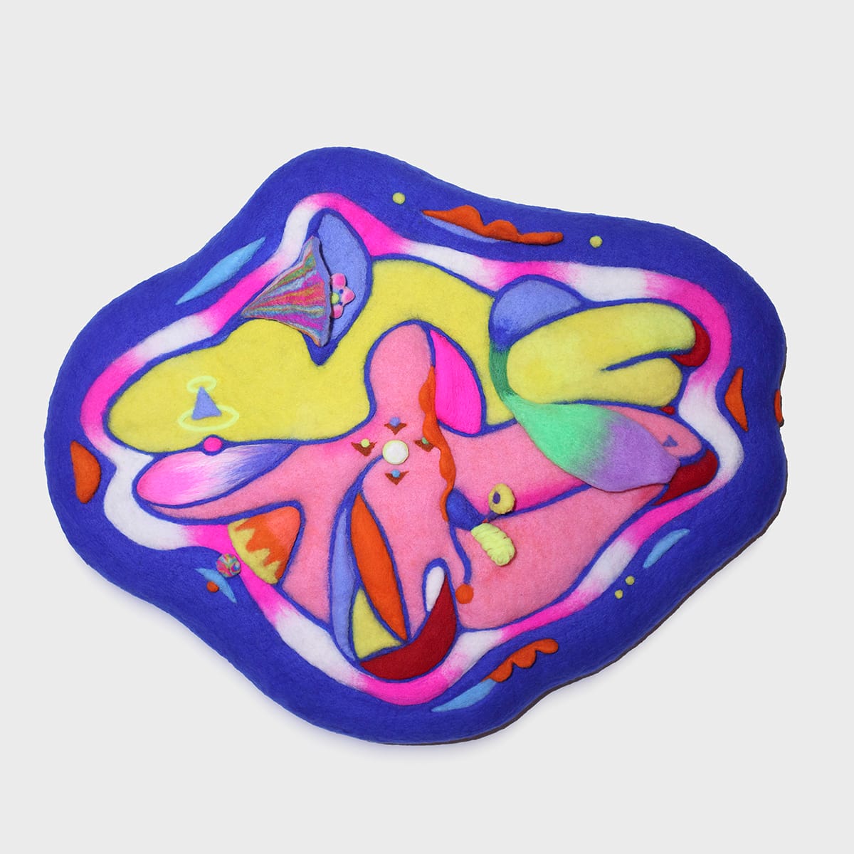 Davina Hsu’s creative practice is an exquisite embodiment of uplifting metaphysical and esoteric sensibilities. Heaven on Earth presents a series of recent works consisting of natural wools on foam; the six colorful pieces in this show seem to hum together in some ethereal harmony. “The Shift” (all works 2025) features a rainbow quasi-landscape in the middle with a turquoise border all around, while “Adored” recalls a slice of a stained-glass window. Hsu’s elegant series culminates with “Inner Temple,” a vertical work with pink, yellow, and neon greenish tones that vibrate with an energy that is simultaneously graphic, organic, and mystical.