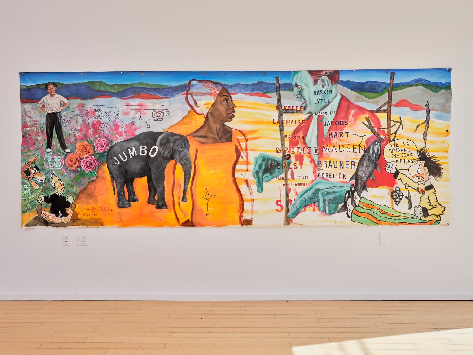 Catskill Art Space’s current trifecta of exhibitions reflects its longstanding commitment to dynamic shows showcasing regional artists. Jeffrey Christensen’s colorful mixed-media paintings mash together culture and politics; George W. Bush, for instance, can be found in the collage-like landscape of “Baskin Lytle” (2019). Meanwhile, Bonnie Rychlak’s industrial-meets-modern sculptures celebrate raw forms; “Another Rabbit Hole” (2023), for instance, is a playful encaustic round sculpture with a hole in the center and black nubs around the circumference. Heidi Schlatter’s “Ore” (2025), depicting a particularly jagged example of the metal, fuses photo, sculpture, and portrait at once in her exploration of the environment and American expansionism.