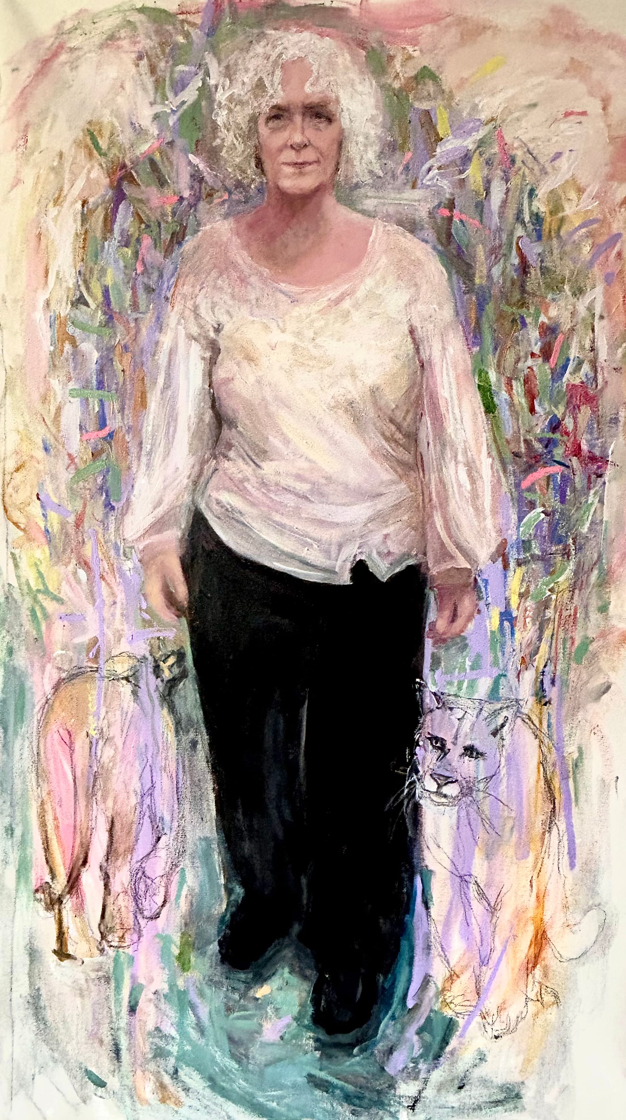Portraiture — capturing not just the likeness but the essence of someone — is a challenging assignment. Artist Nancy Catandella tackles the medium with both finesse and sensitivity as seen in a series of expressionistic portraits of her friends at Greenkill in Kingston. “Wayne” (2025) is a tall and handsome gentleman in a black suit, his countenance one of questioning and concern. “Elaine” (2024) is a cool cat in her dapper bowler hat, and “Judy” (2024) stands resolute with two spirit-like bobcats circling her lower body. While these portraits might seem unfinished because of their frenetic mark-making, Catandella conveys the power of each sitter with command and care.