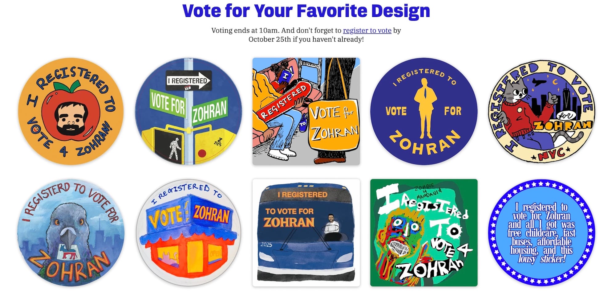 Hundreds of artists submitted designs to Mamdani’s 36-hour “I Registered to Vote for Zohran” sticker contest. They focused on quintessential New York City imagery like public buses, street signs, subways, and pigeons that were then voted on by thousands of users online.