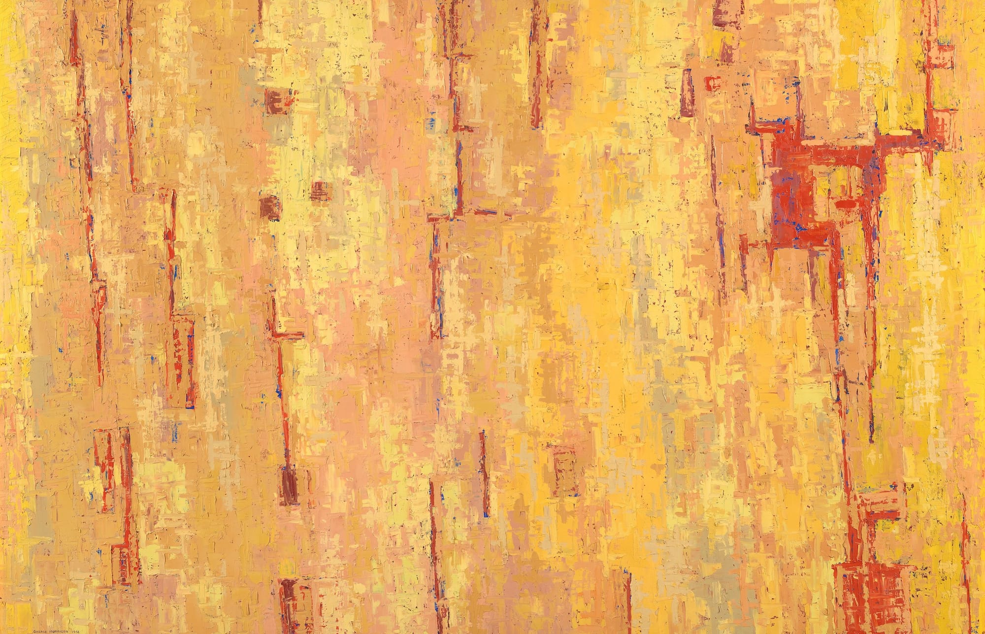 In “Aureate Vertical,” the subtle tonal shifts pull viewers closer and slow them down. While we may get lost in the looking, however, our reveries are interrupted by streaks of red and bits of blue peeking through a surface dominated by yellows and tans. In “The Red Sky” the interlocking gray, dirty white, and reddish-orange forms might be holding up the sky’s thick slab. Or is the sky pushing down, compressing the forms? The tension is palpable.
