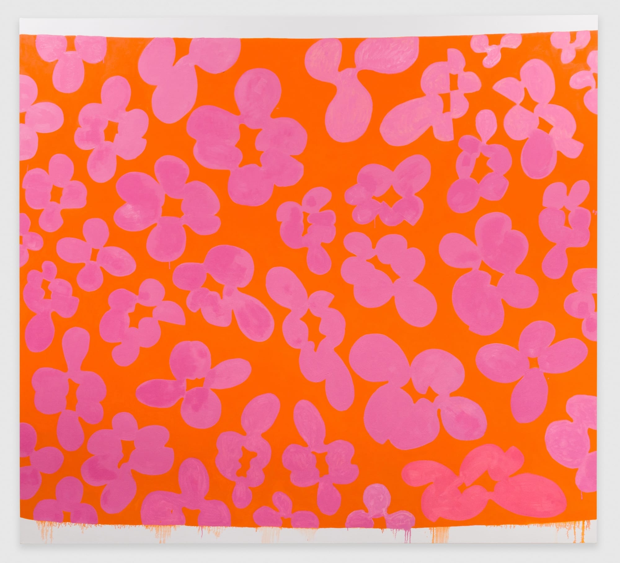 “Crepusculo” is a pulsating field of mauve quatrefoils and distorted variations on an orange field. Ledgerwood has painted an orange rectangle whose top and bottom edge sags in the middle against the strict edges of her stretched canvas. With rivulets of orange and mauve dripping along the bottom edge, the irregular rectangle becomes a cloth, like the cerulean blue and yellow one we see draped over a turquoise screen in Henri Matisse’s “The Pink Studio” (1911). The difference is that Ledgerwood’s cloth is made of paint, drips and all. I think the artist wanted to extricate this piece of decorative fabric from the harem, a space both private and public, to the intimate space of the bedroom. Seeing is private.