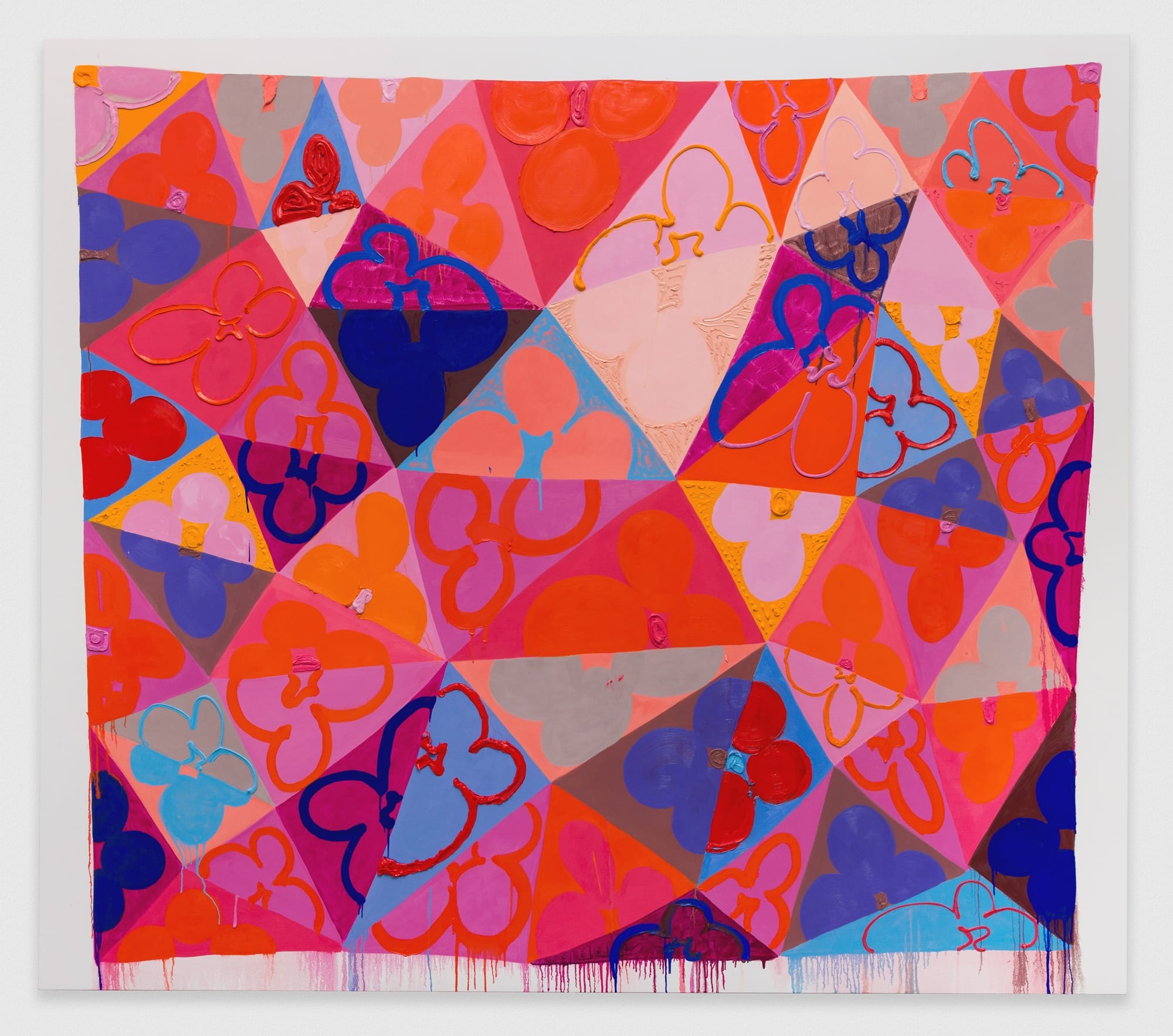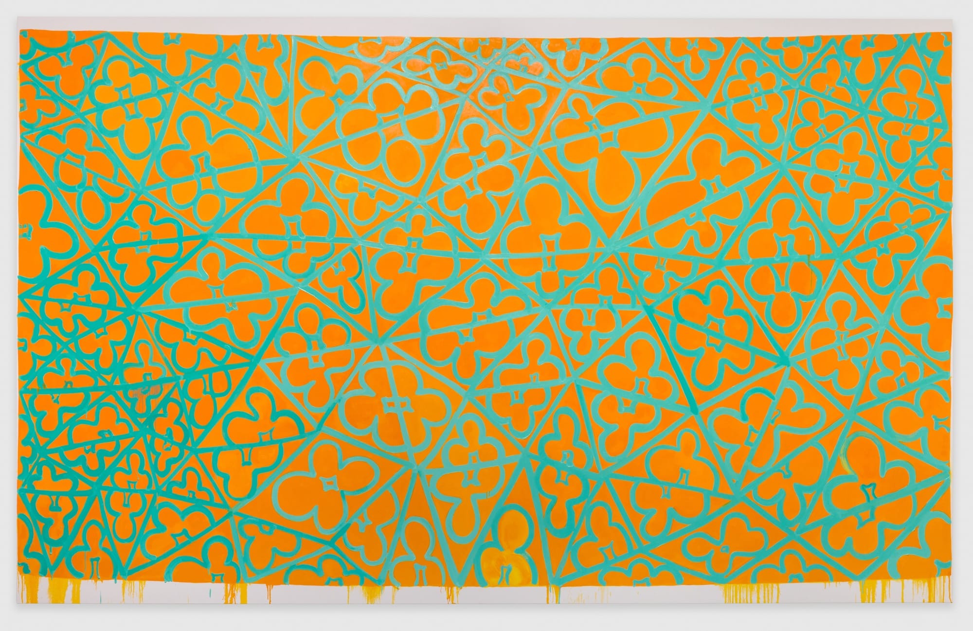 Ledgerwood’s manipulation of formal structure within individual works accelerated my appreciation of her play with dimensions, from the skewed linear grid of unequal triangles occupied by a hand-drawn trefoil in “Vitamin C” (all works 2025) to the vibrant opticality of different trefoils, some of them mirrored, dispersed across a monochromatic ground in “Crepuscolo.” Hung on opposite walls, this pairing made me look more closely at how each of the four paintings talked to each other as well as held their own ground.