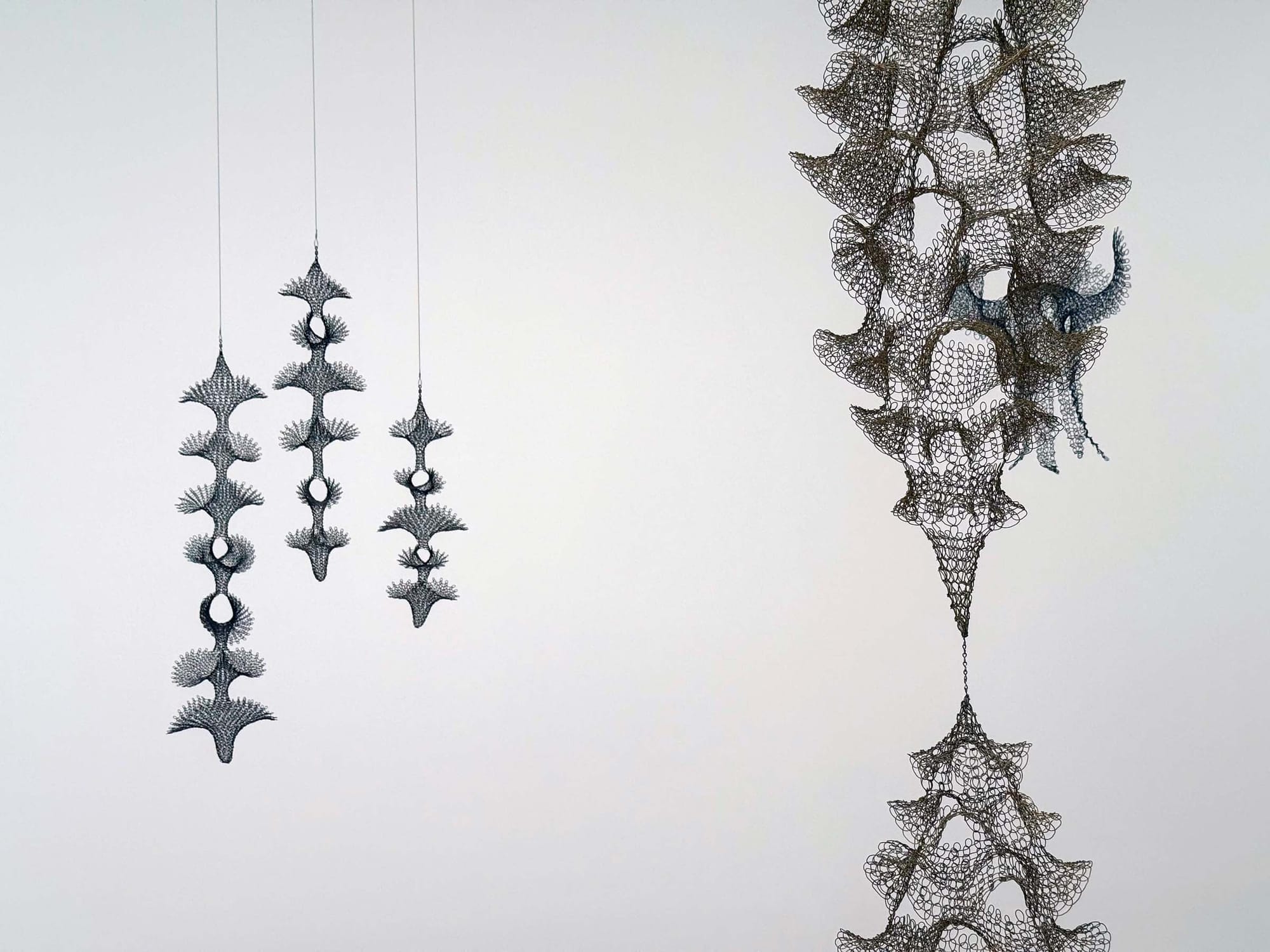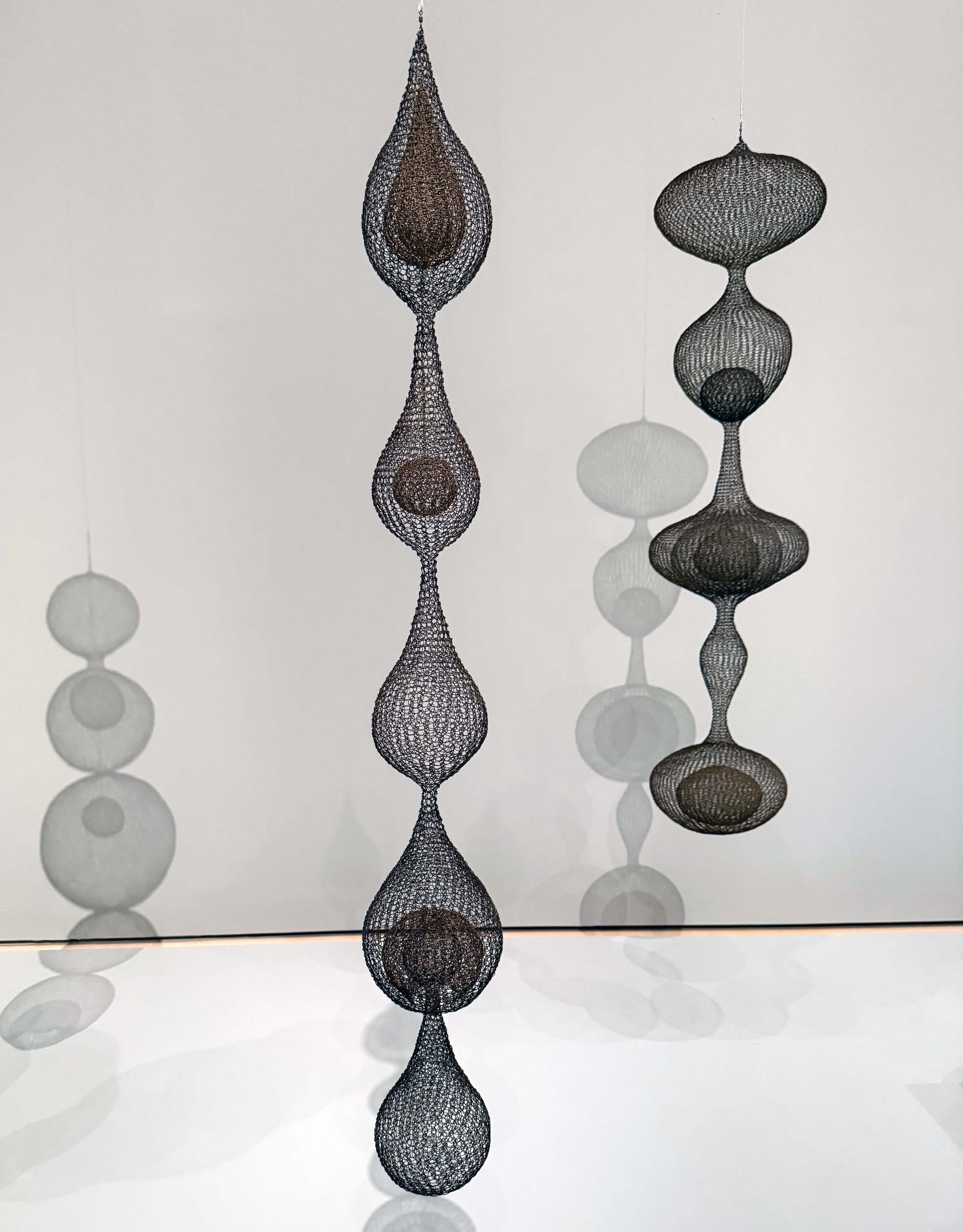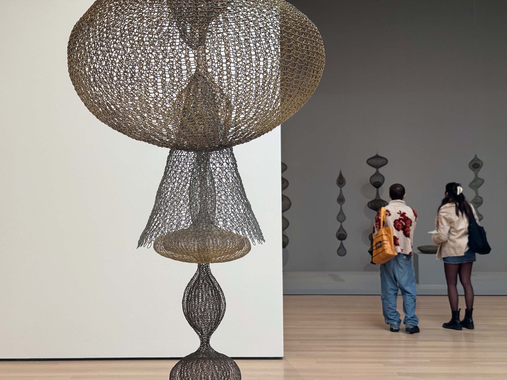 Asawa’s basket sculptures seem to make that continuity between all things tangible. Figuring out how they come into being twists the mind into a Gordian knot, turning the simple task of following a plane into the experience of traversing a Möbius strip: exterior becomes interior becomes exterior again. Each work toggles between all manner of forms — anthropomorphic figures and alien creatures, deep-sea invertebrates and uteruses — at once, and yet somehow they’re always more. One has a raindrop-shaped head and tail, like a continuous chain of fluid moments suspended in time, where the beginning is also the end. Another evokes stacked witches’ hats or wormholes, child’s play and the very fabric of time-space at once. They sway or spin so slowly that they seem cosmically removed from you, like a planet that turns once in your lifetime. And yet you’re an integral part of that very system — it’s your steps, your breath, that propels them.