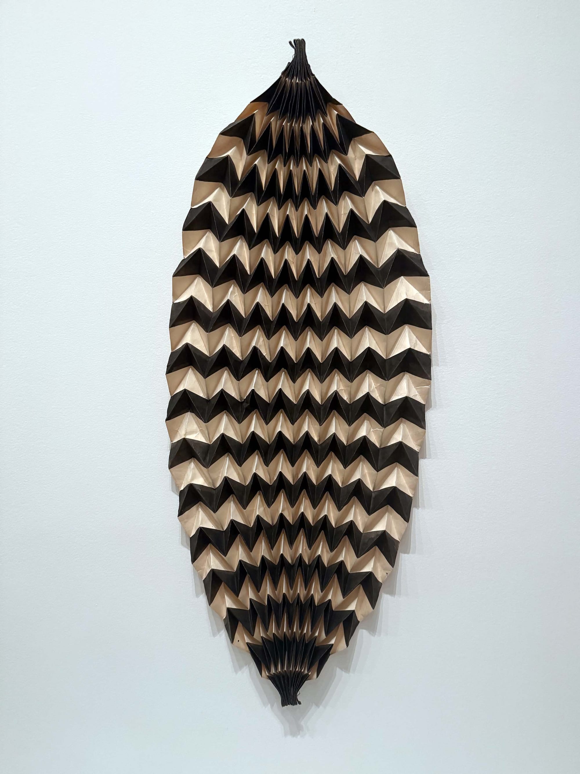 In fact, we are part of Asawa’s artistic germination from the very first room, dedicated to the time she spent in her early 20s at Black Mountain College, in the late 1940s. In an untitled oil and watercolor on paper inspired by autumn leaves, bulbous forms that anticipate the silhouette of her later sculptures overlap gently, as if nuzzling. The thin support buckles under the weight of the pigment, as if struggling to hold the full measure of Asawa’s vision. Nearby, the oil-on-masonite “Figures on Green” (c. 1947–48) contains eight rounded figures with arms held aloft in various states of elongation and compression, as if they’re leaping off the surface. A couple of years later, she found the dimension she was searching for, with paperfold works that zigzag dizzyingly on the wall.