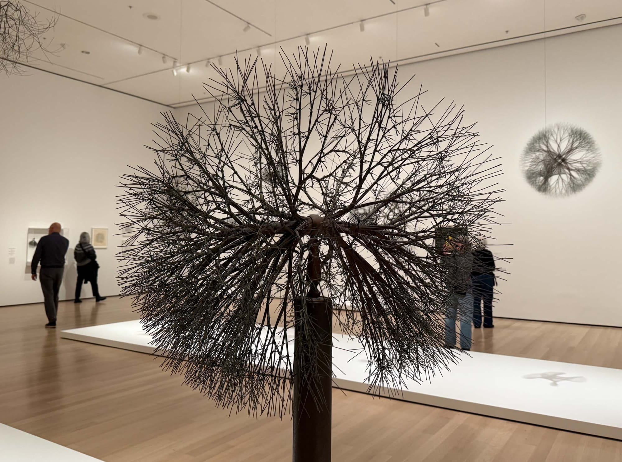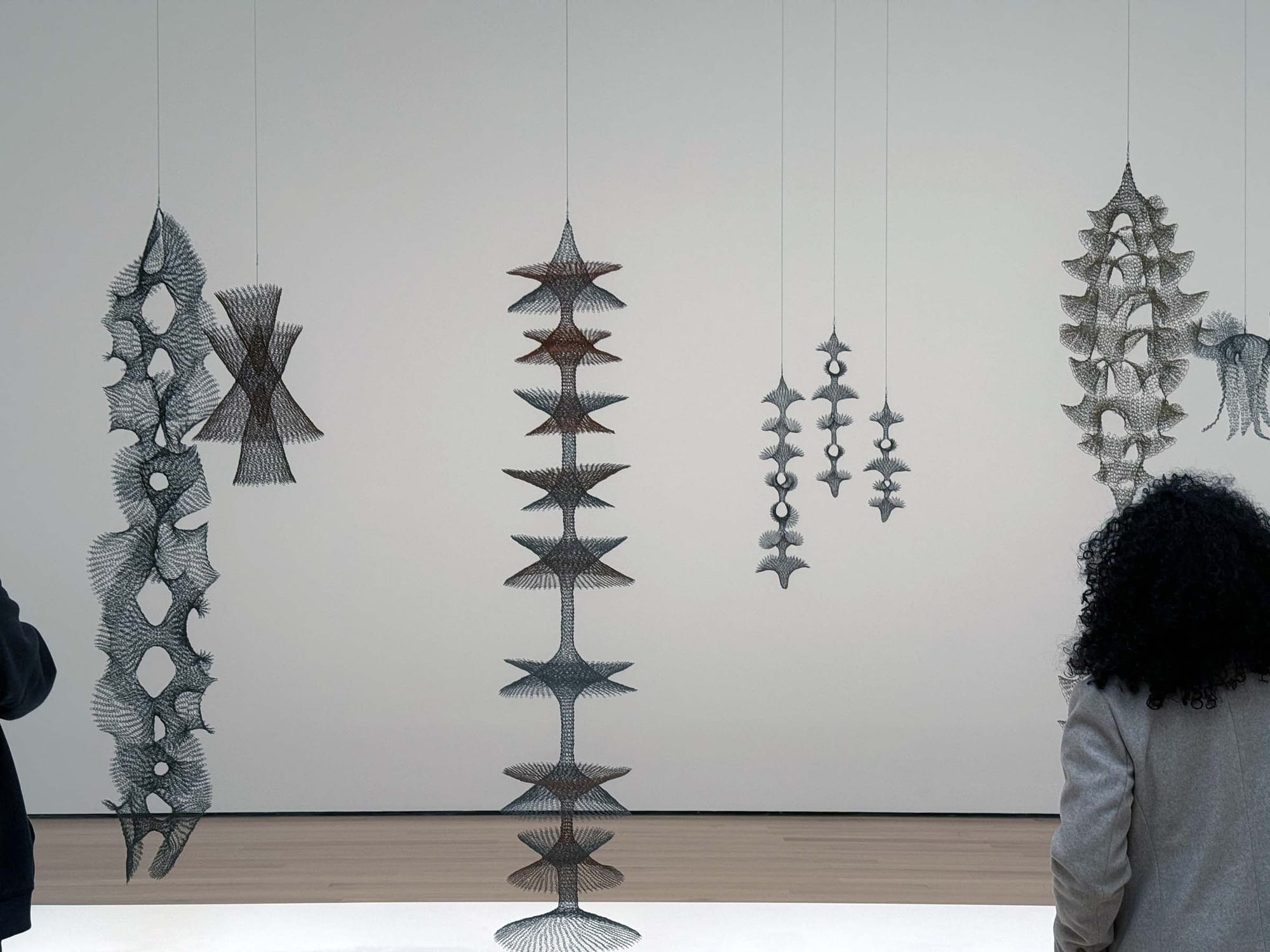 Later in life, Asawa’s sculptures became fractal, exploding outward rather than tending inward, each branch end begetting ever more. Are they roots or tendrils, beginnings or ends? As always, both, and then some. I raised my arms to take a picture and, looking at my own shadow, saw myself as one of those ecstatic leaping figures from that very first gallery, as if I had been spun off the tip of one of her dandelion sculptures and sent out into the world as both messenger and message, the infinite seed of her vision contained within me.