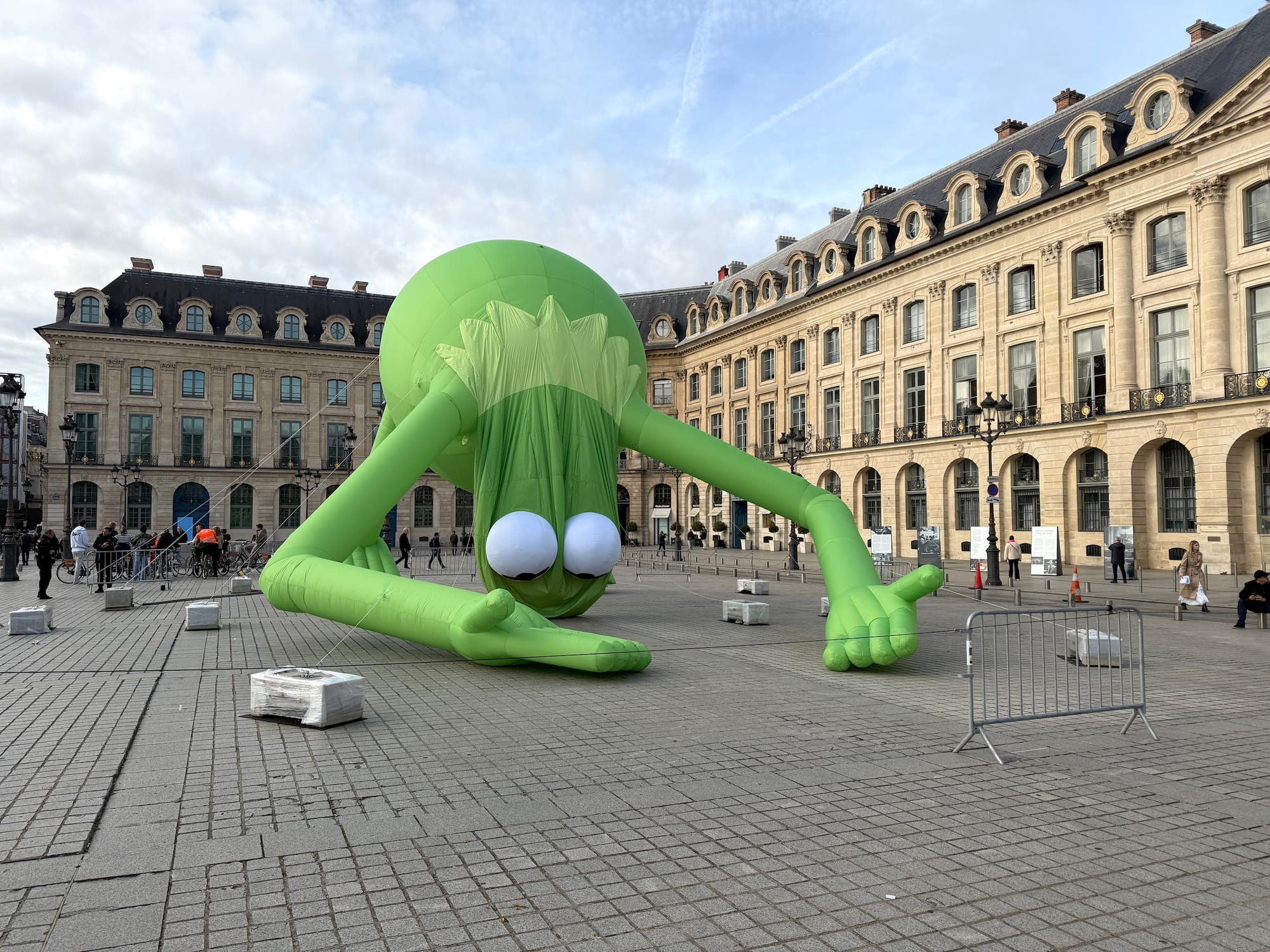 Somewhat omnisciently, Alex Da Corte installed a giant, partly deflated balloon-statue, “Kermit the Frog, Even” (2018/2025), outside the Place Vendôme during Paris Art Week. The work “reveals our collective anxieties,” according to a label. Located in a posh address near the Grand Palais, surrounded by high-end shops and hotels from Chanel to the Ritz, this cheeky green muppet is losing air from within amid all the affably aged glitz.
