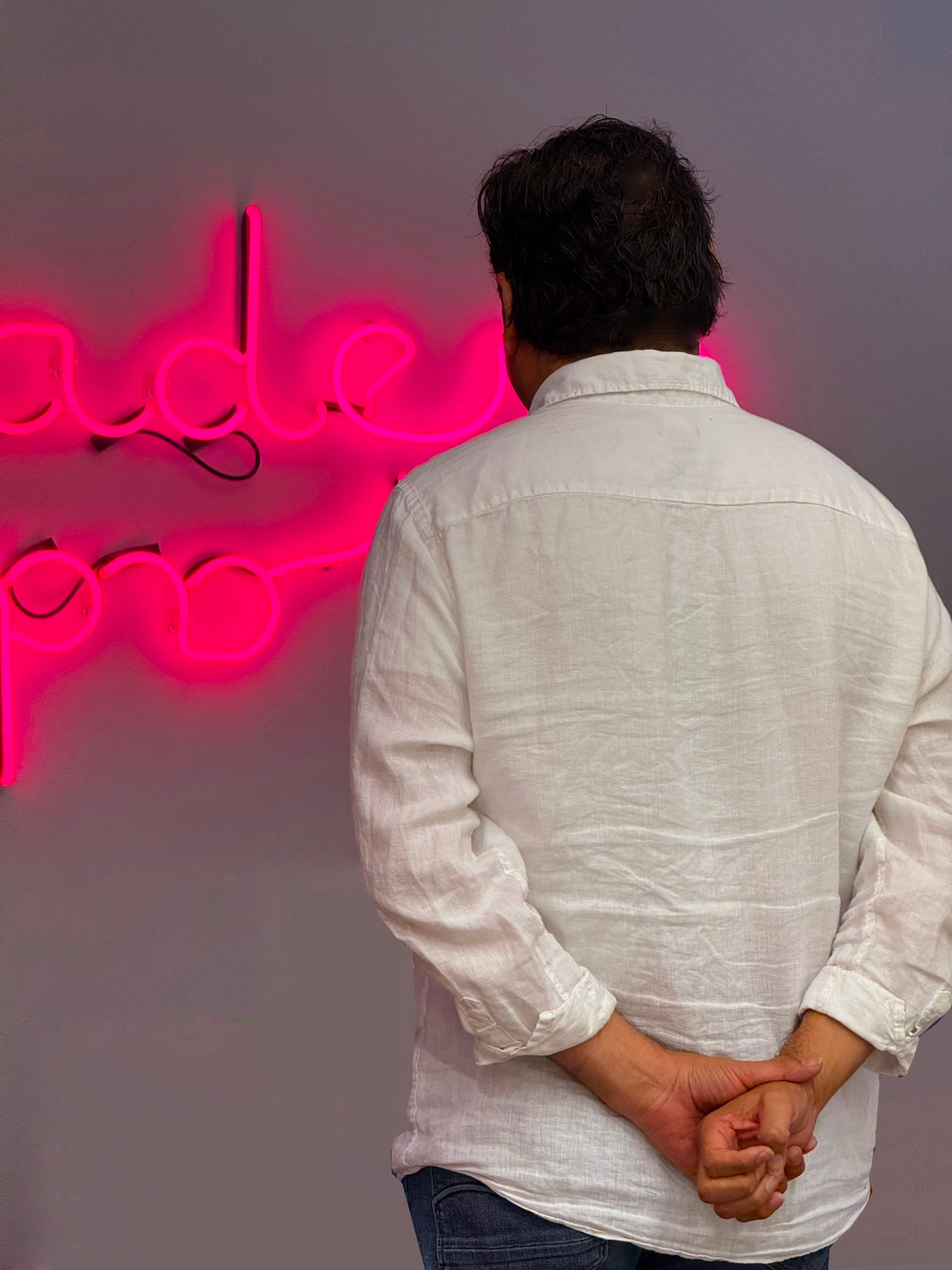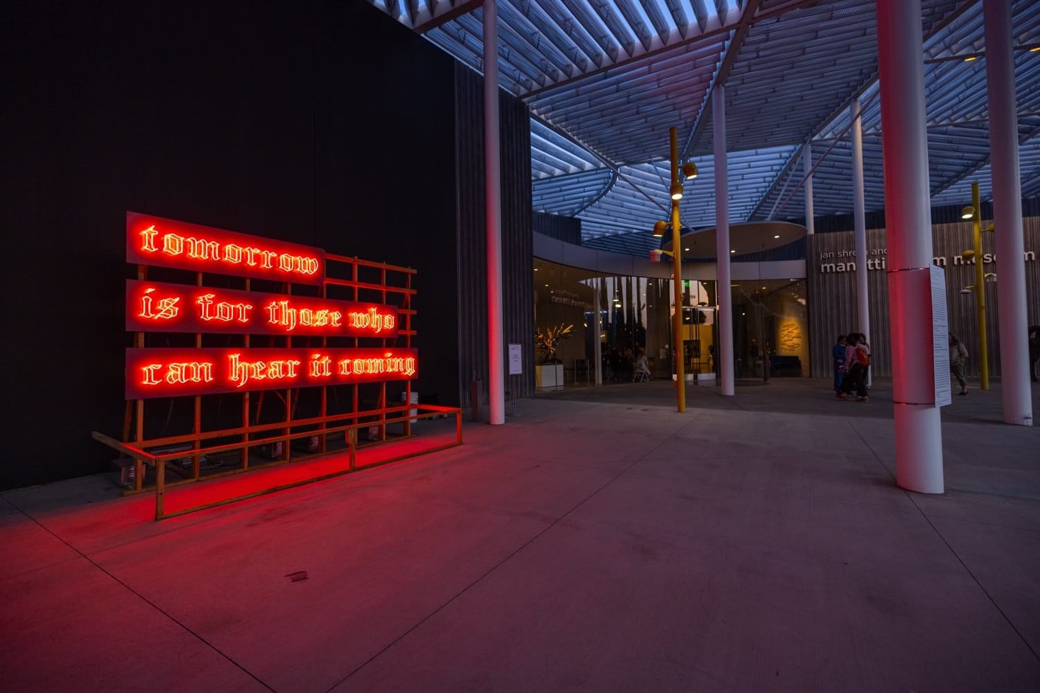 The other is a public commission installed within the museum’s public plaza. The sign, built on humble wooden scaffolds, reads in Gothic neon letters, “tomorrow is for those who can hear it coming” — a riff on the slogan David Bowie coined to promote his album Heroes. This burnished multivalent message sets up the potent through line of “OJO” Julio César Morales: In today’s social climate, who has the privilege of having a future and who does not?
