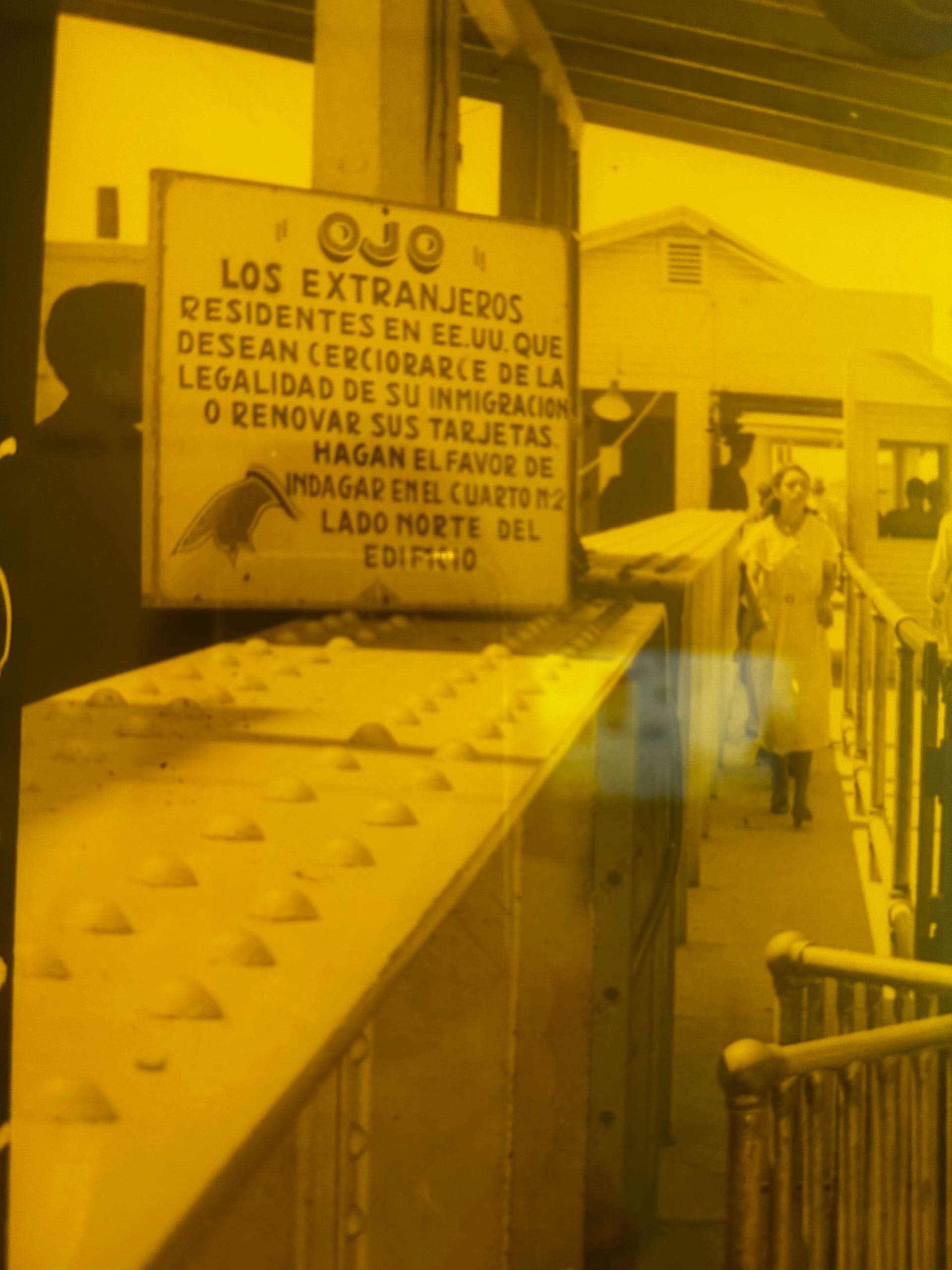 "Ojo" directly translates from Spanish to English as “eye,” but it is also a colloquial expression of warning: Open your eyes! Look out! Cuidado! "Extranjeros" translates to “strangers” — for whom is it a warning? Those arriving or those already there? This series and the exhibition as a whole point to this underlying paradox of the immigrant experience.