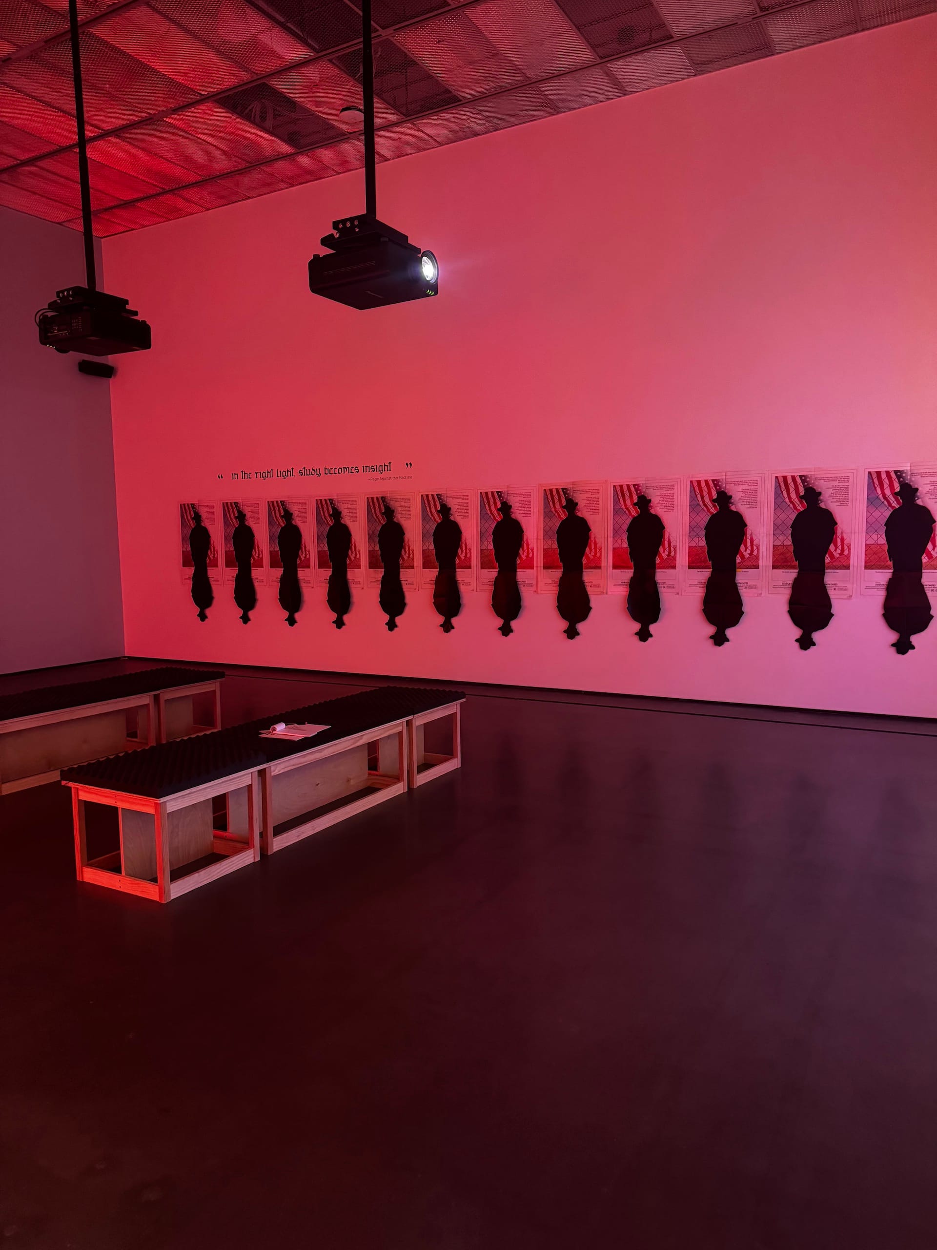 The show crescendoes in the final gallery, which features three of the artist’s most powerful works (all from 2025), created in response to the 1982 film The Border, Hollywood’s first dramatization of the US-Mexico border. A series of ghostly black cut-out movie poster silhouettes populate the back wall of the gallery as two videos play face à face, alternating sequentially.