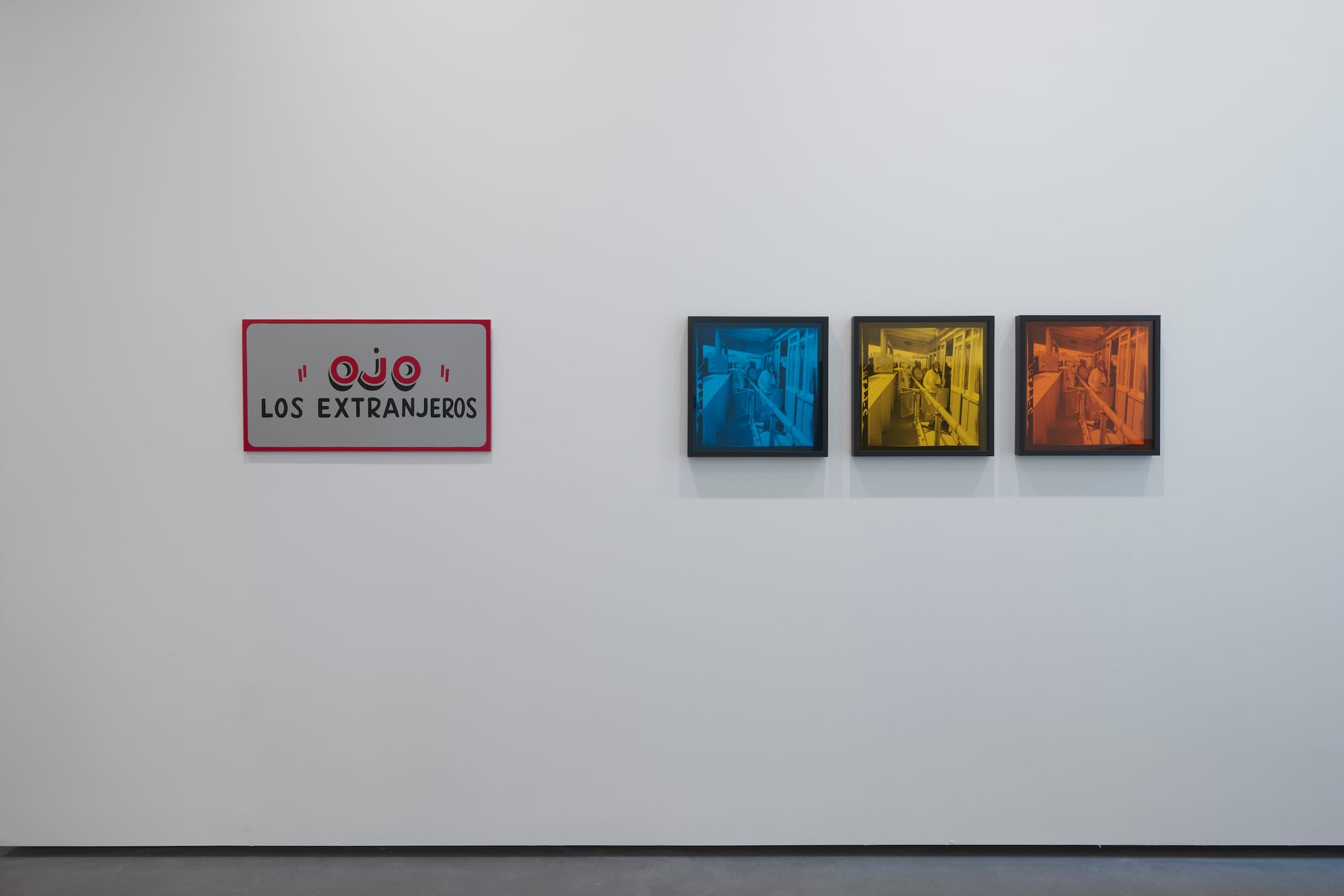 The exhibition derives its title from a detail Morales discovered in a Dorothea Lange photograph from 1938: a hand painted wood sign, or rotulo, common to border culture, that reads “OJO” Los Extranjeros. Morales’s recreation of the sign hangs alongside a three-print series of the original photograph behind blue-, yellow-, and red-tinted plexiglass.