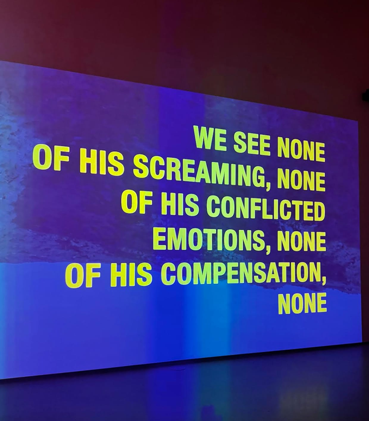 The video “We Don't See” (2025) reimagines The Border again, this time from the perspective of Francisco Cantú, the artist’s friend and a former Border Patrol agent. Cantú’s own conflicted internal dialogue as a Mexican migra is overlaid in all yellow bold caps over drone footage of the Sonoran Desert: “We see none of his screaming, none of his conflicted emotions, none of his compensation, none of his moral outrage, none of his complexity.”