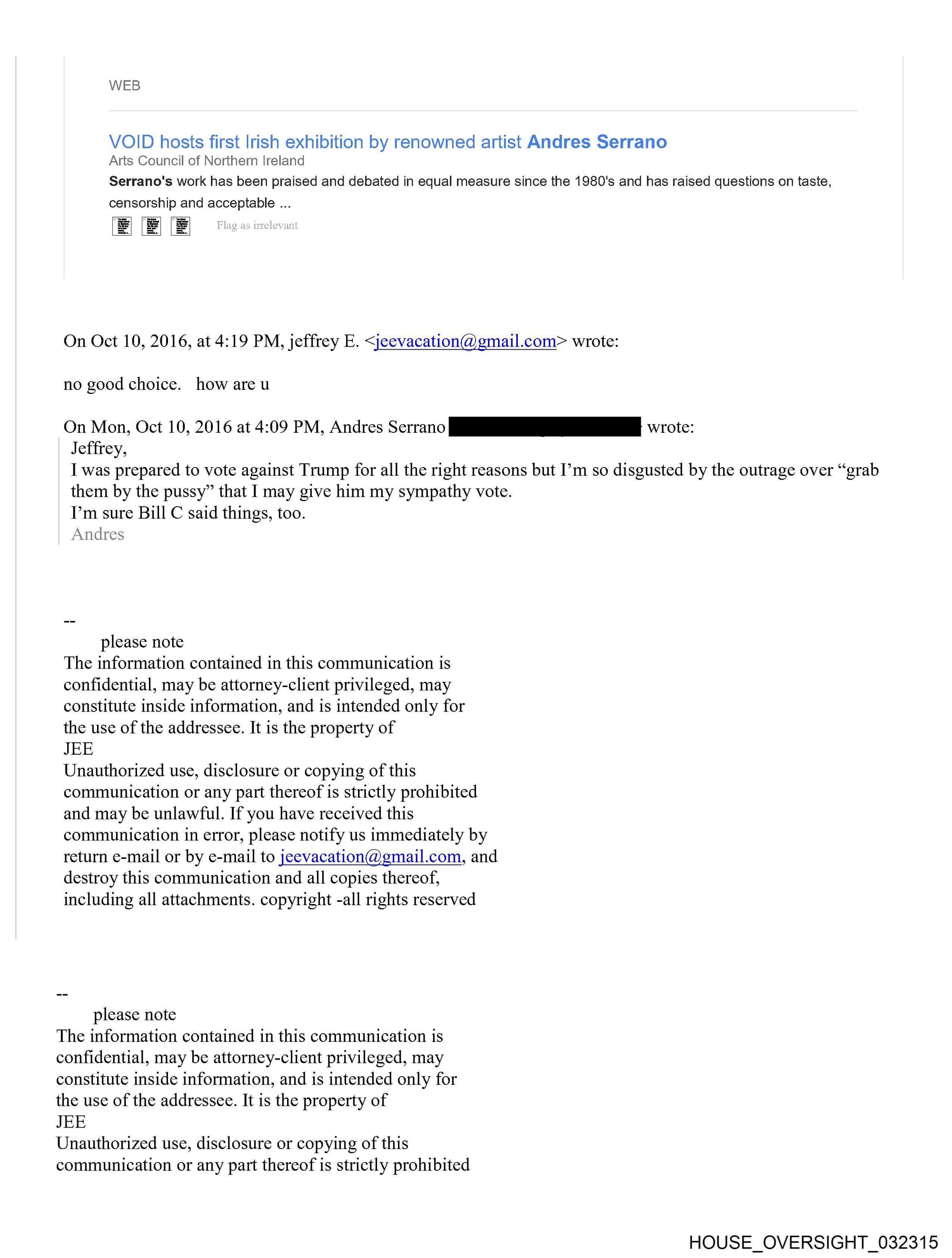 "I was prepared to vote against Trump for all the right reasons," Serrano wrote to Epstein. "But I'm so disgusted by the outrage over 'grab them by the pussy' that I may give him my sympathy vote."
