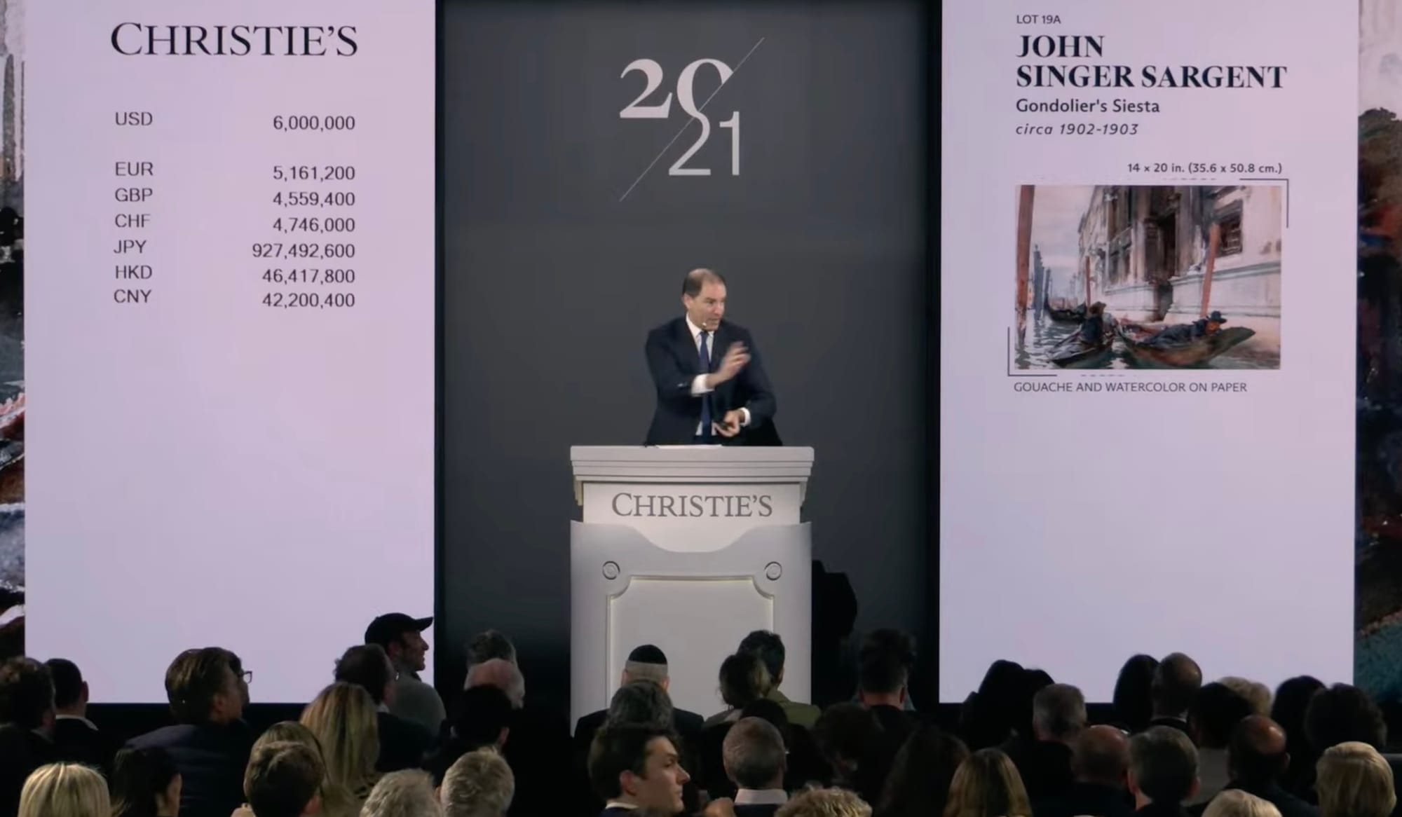 Though last night's 20th Century Evening Sale at Christie's, the first of New York City's fall marquee week, was by all accounts a successful auction, there were not many surprises. It was not exactly shocking that the night's top lot, a desirable flame-colored Rothko from the Weis Collection, went for $62 million. Few eyebrows were raised when Matisse's "Figure et bouquet (Tete ocre),” already requested by MoMA for a show next year, climbed from $10 million to $13 million in seconds, eventually fetching three times that. But the energy shifted when Lot 19, a 14-by-20-inch watercolor by John Singer Sargent, finally hammered at $6 million ($7.2 million with fees) with a buyer in the room, culminating a dextrous four-minute show of patience and humor by auctioneer Adrien Meyer. “Look at it,” he instructed a bidder on the floor at one point, signaling to an image of the work on the screen behind him. After he struck the gavel, people clapped; one person hooted.