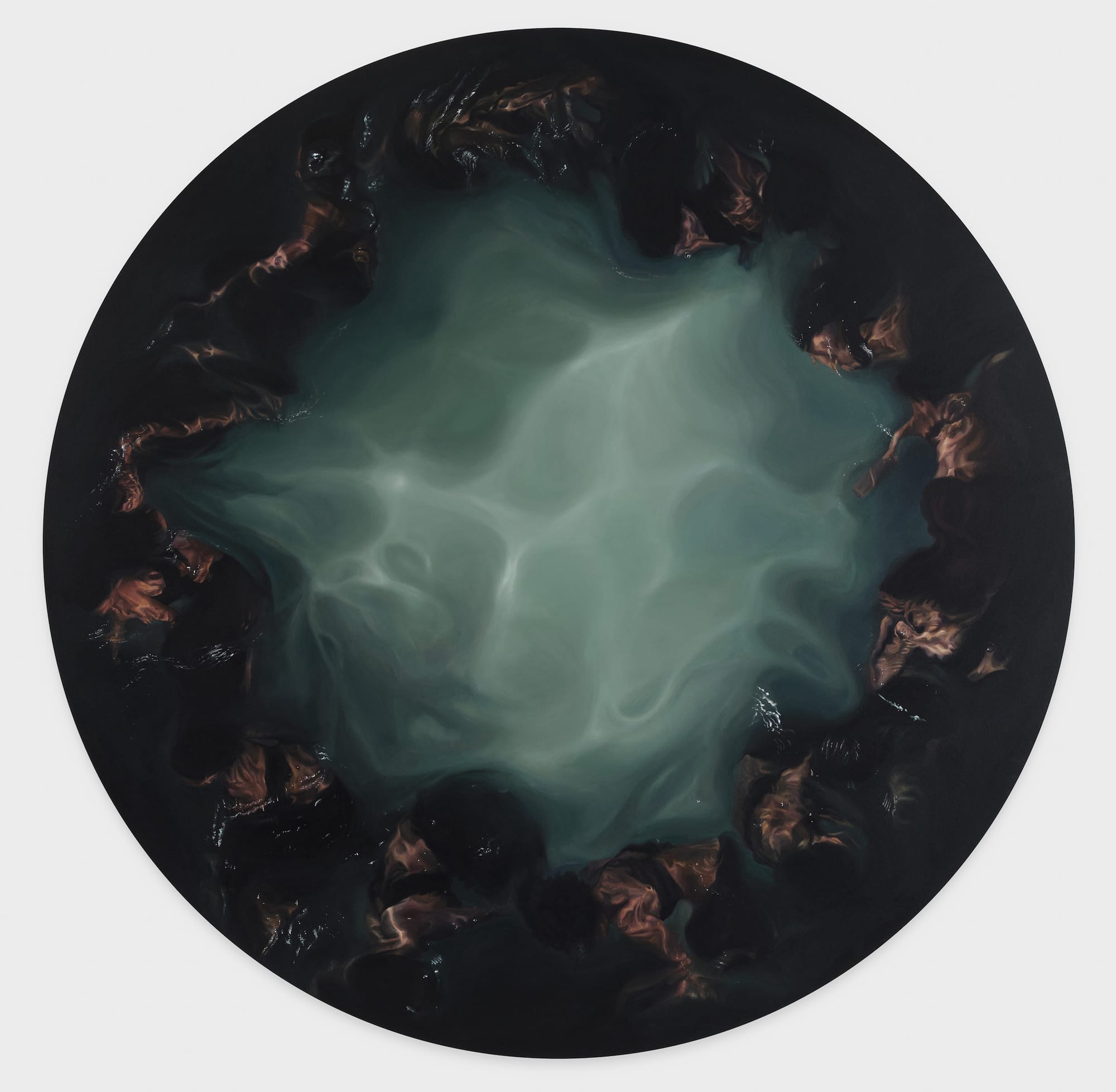 With the quiet reverence of religious icons, Calida Rawles’s expansive canvases portray Black women and girls floating in pools of water, their faces hovering just above the surface as their tulle gowns fan out majestically below it. Drawing symbolically from the theory of water memory, which stipulates that liquid retains the traces of substances diluted in it, Rawles captures moments of tension, grace, and resistance. In the tondo painting “Like Other Gods With Ancient Rage” (2023), the most stirring work in the show, submerged figures ripple and swirl around a bright center of light. —Valentina Di Liscia