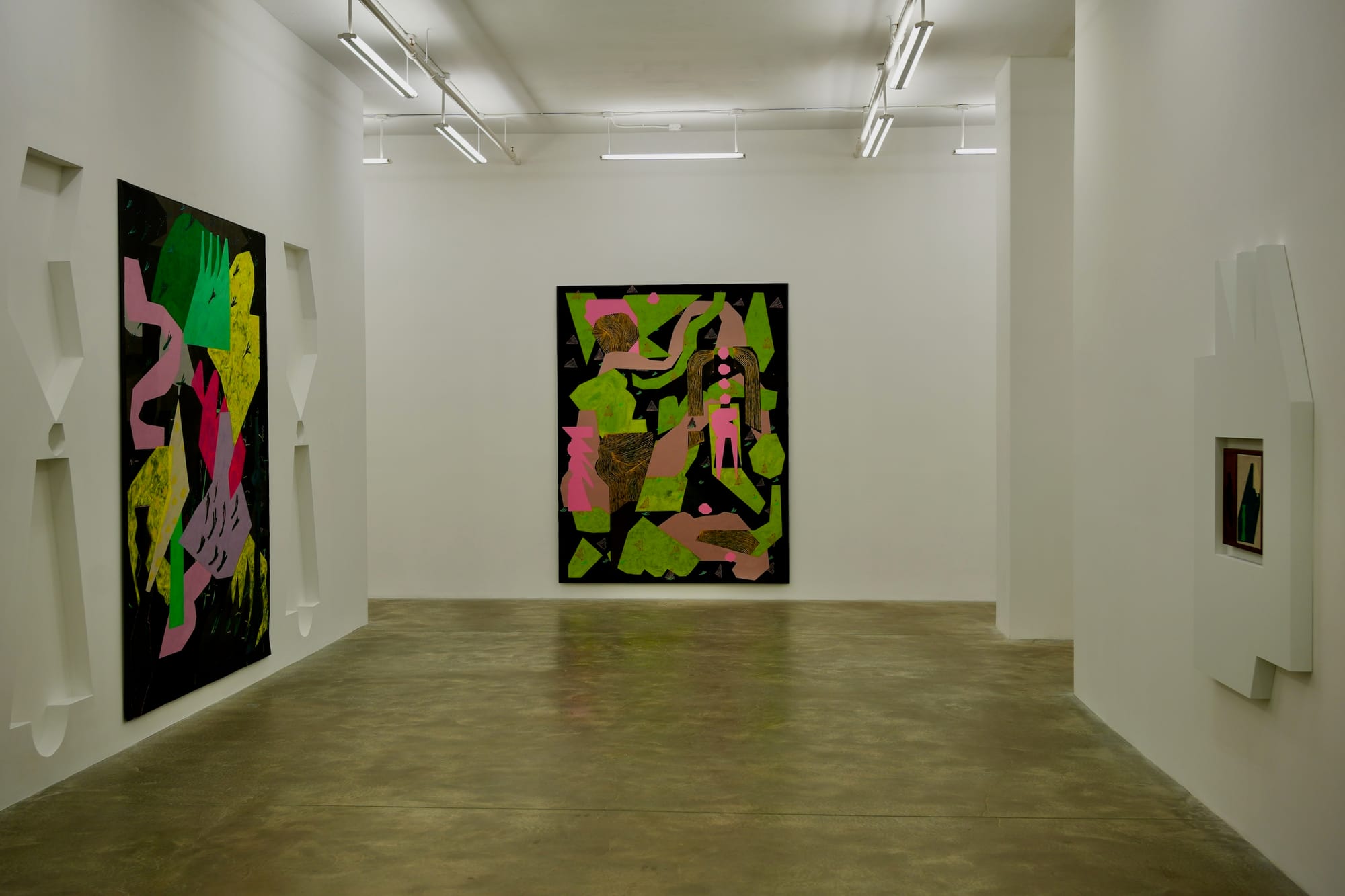This is an elegant show from an artist with a knack for sensitively placing work in relation to the viewer and the gallery space. Caroline Kent’s current exhibition includes not only unstretched canvases that hang on the wall, much like a type of tapestry, but also curious white geometric cutouts that scoop out sections of the wall or sit atop it like forms glued to a surface. The largest sculptural forms on the wall are called columns, and they expand what she’s been doing with shapes and color for years. Even if the rhythm between the wall works and canvases doesn’t feel fully hashed out, particularly in the brightly lit and light-colored galleries that make the largely dark paintings look more stark, the final effect is intriguing and contributes to what feels like her continuing journey to create new languages of abstraction for the 21st century. —HV