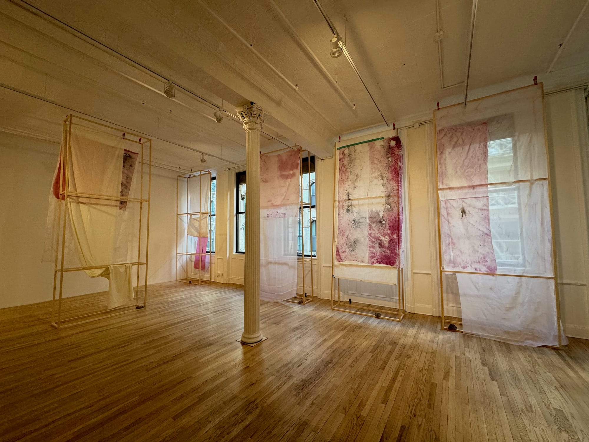The artist, who is of Omaskêko Cree ancestry, loves his sparse minimalism that plays not only with artistic references and history but also with societal norms and expectations. A master of withholding in a culture that expects perpetual insight into minoritized and oppressed communities and how they’re feeling or thinking, Linklater seems to say, “F*** that.” He continues to forge a path towards combining the old and new, the familiar and unfamiliar, without falling into the same tropes and clichés that plague the field of contemporary art in North America, particularly connected to Indigenous perspectives. Who is “dressing” whom here? Are we being shielded from outside forces? Is his work a filter through which to see the world anew? The curtain-like works, covered with ghostly imagery that has been imprinted and then erased, remind me of Robert Rauschenberg’s Jammer series from the 1970s and the new possibilities that body of work presented to viewers. Like Rauschenberg, I think Linklater is helping lead us forward into something new and less precious so we can prepare for what comes ahead. —HV