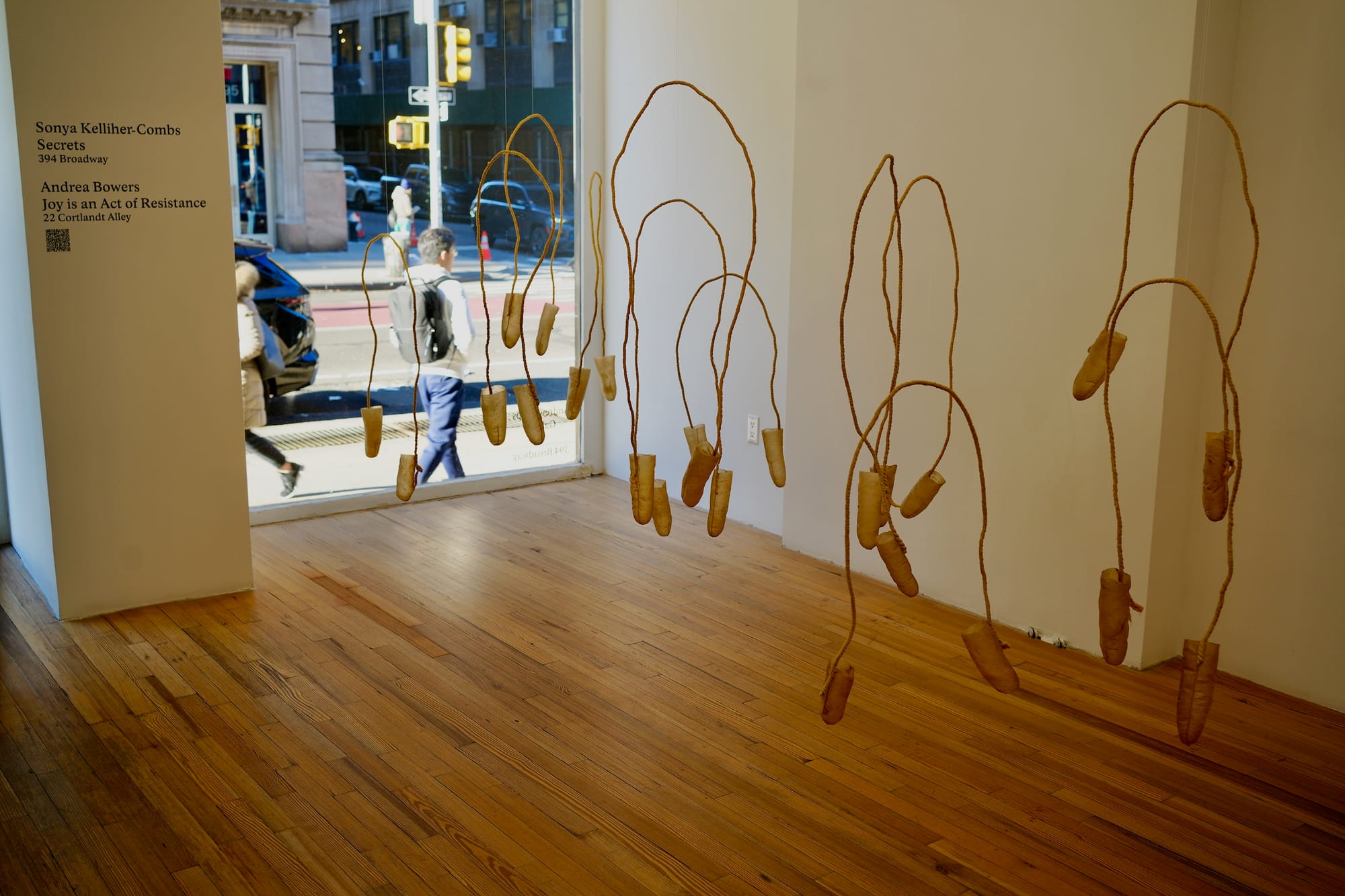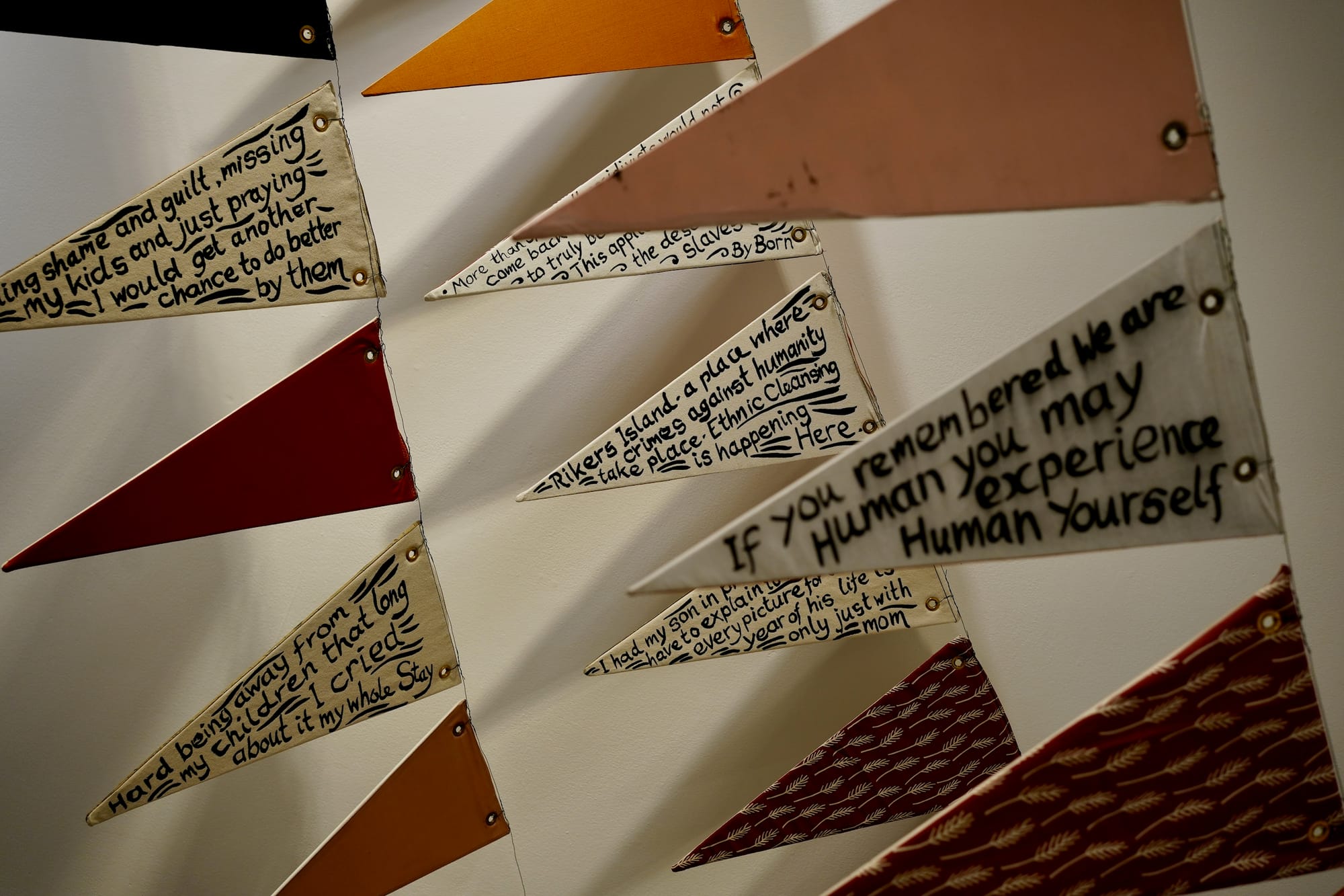 But don’t miss Jenny Polak’s quietly powerful one-room show nearby, where she fashions objects that base themselves on domestic items transformed with a new consciousness around incarceration and the violence of borders. In one work, what looks like the West Bank barrier is crafted onto tiles you might see in a kitchen counter backsplash, while in another, pennants are covered with the words of those who speak to us from behind bars. —HV