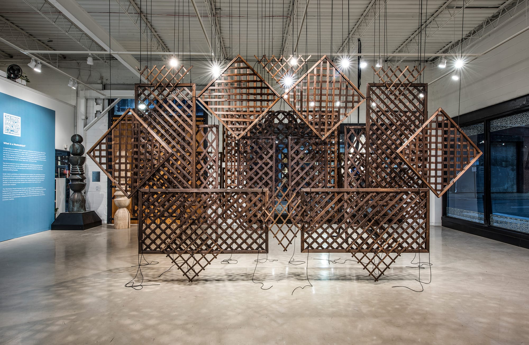 This project at the Museum for Art in Wood honors the mashrabiya, a traditional wood-carved lattice screen that separates public and private life in some Islamic architectural traditions. Installed in a window along with a jar of water, the mashrabiya’s delicate patterns offer both natural ventilation and separation between women and men in religious households, among other functions. This exhibition focuses on latticework in Cairo, Egypt, which is said to have birthed the craft of woodturning three millennia ago. The show brings together contemporary women artists with Muslim cultural roots who craft bold and beautiful experiments out of wood, fabric, and glass, each inquiring into the significance and complexity of the mashrabiya today. Visitors are also invited to curl up in the exhibition’s Īwān, a cozy seating area covered in rich carpets, designed for hospitality, conversation, and contemplation.