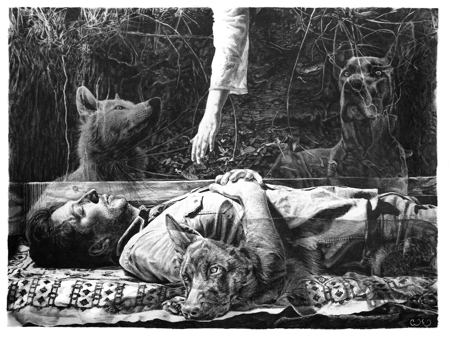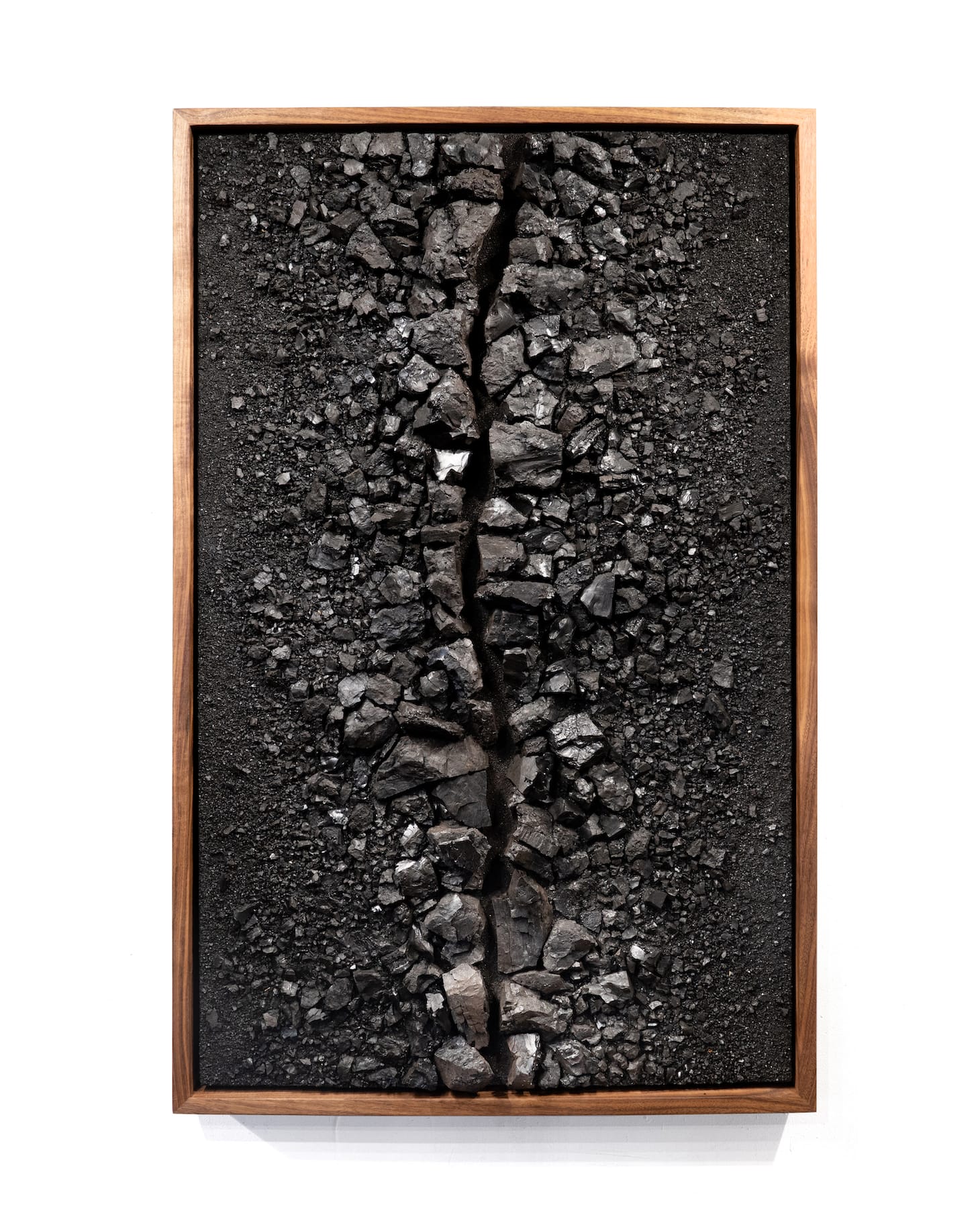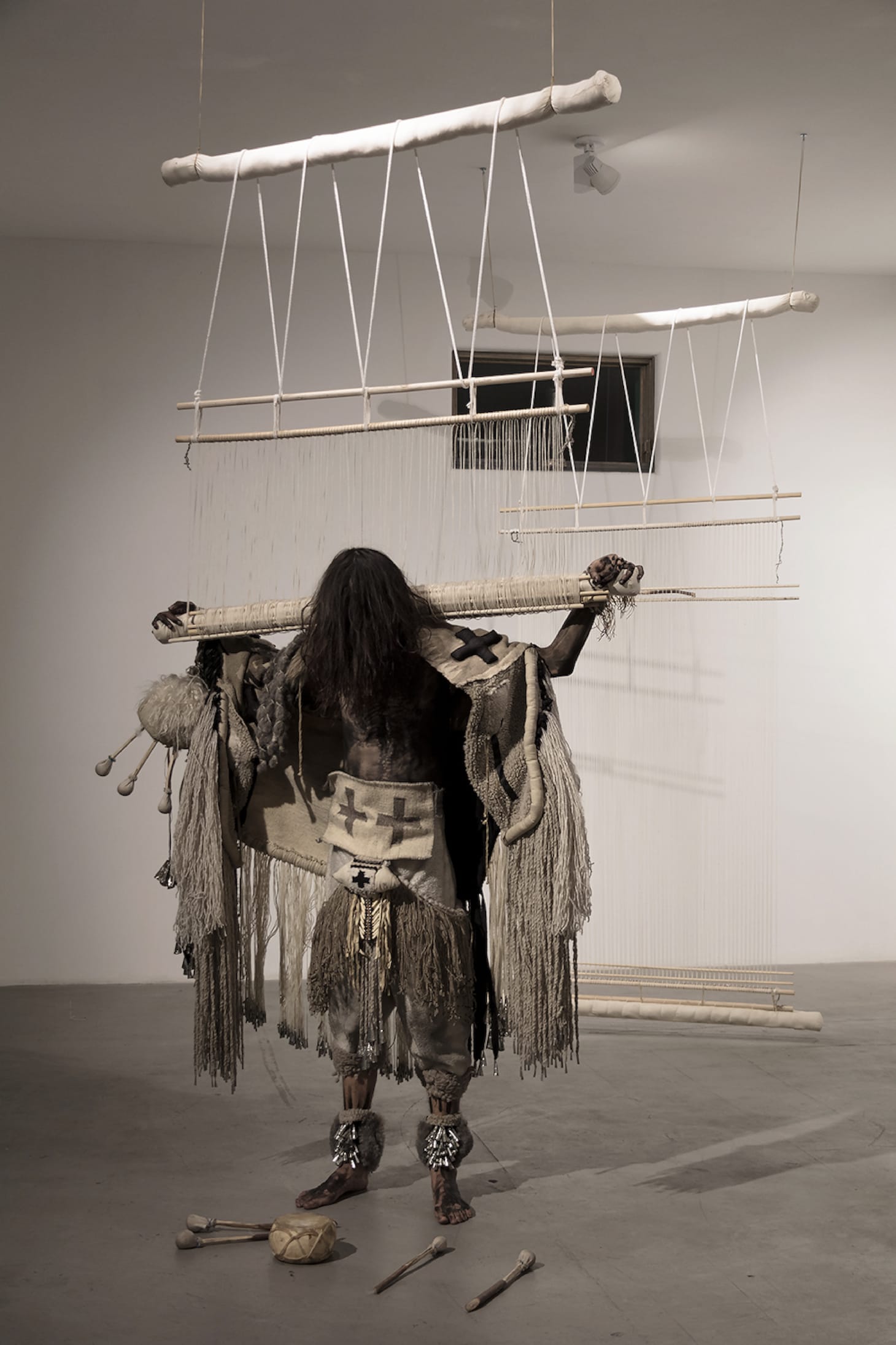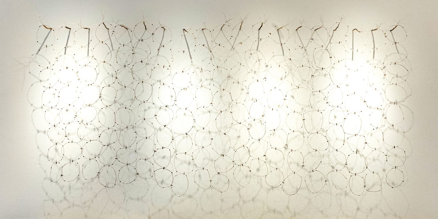 Presented in SWC’s gallery and project/office space, the variety of work in 12 New Mexico Artists to Know Now is immediately apparent: on one wall is C Marquez’s installation “728,” painstakingly deconstructed tumbleweeds that branch out from the plaster before reconnecting, like interlocking daddy longlegs; it faces William T. Carson’s “Concision,” a precise canyon of sculptural black coal set in a spare walnut frame; suspended from the ceiling in the center of the space is Eric-Paul Riege’s mixed-fiber piece “regalia for Hóló ‘ -it xistz and …Son, yáázh, mijo…,” a tightly-woven doll rendered in wool and animal skin, bound to a wooden ladder and adorned with dozens of intricate details, like shells and tassels.