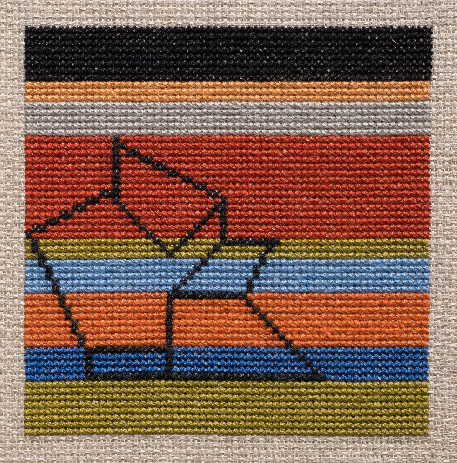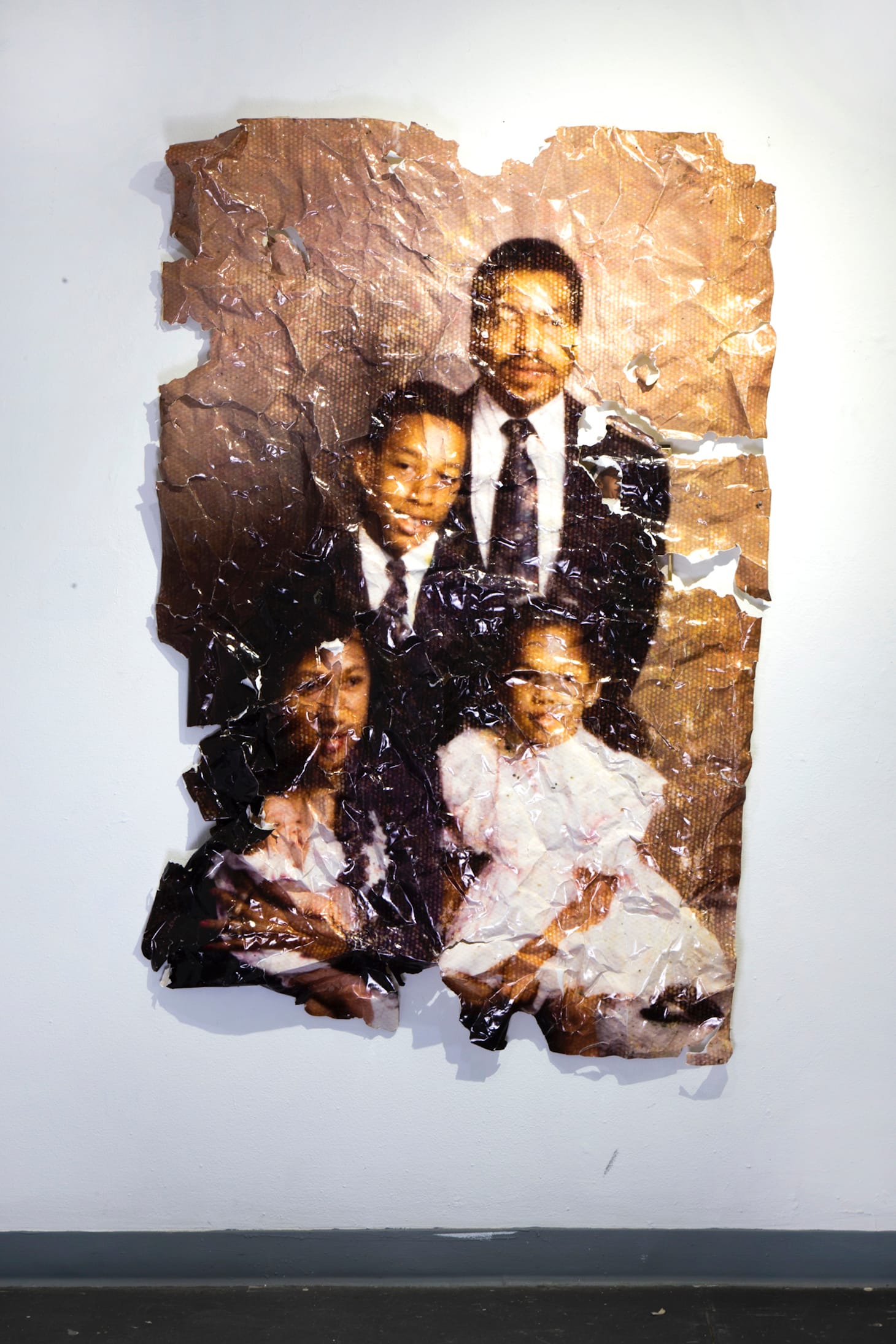 Certain sections are jarring. For instance, moving between MK’s “Our Last Family Portrait” and Danielle Shelley’s cross-stitched samplers “Black Lines 6” and “Modern chair sampler” immediately to the left. “Portrait” is a large print of a grainy photograph of an African American family, posed and in suits and dresses for the occasion. It’s hard to see their eyes, though we search their faces. The print has been crumpled and smoothed many times, is wrinkly and full of holes. Next to “Portrait” are its aesthetic near-opposites, Danielle Shelley’s studies in minimalism: vivid, exact geometric shapes, fine-boned silhouettes of mid-century chairs.