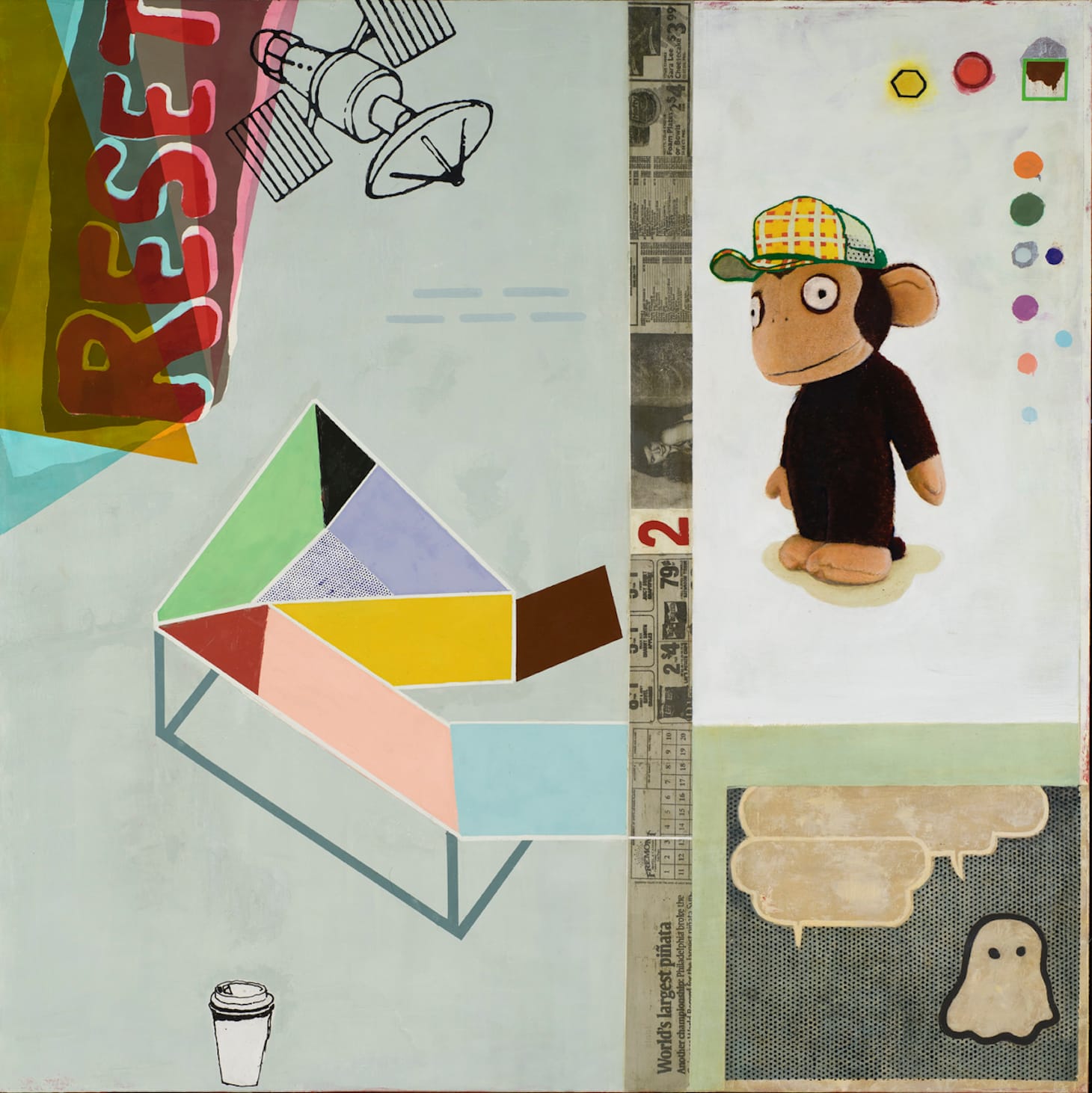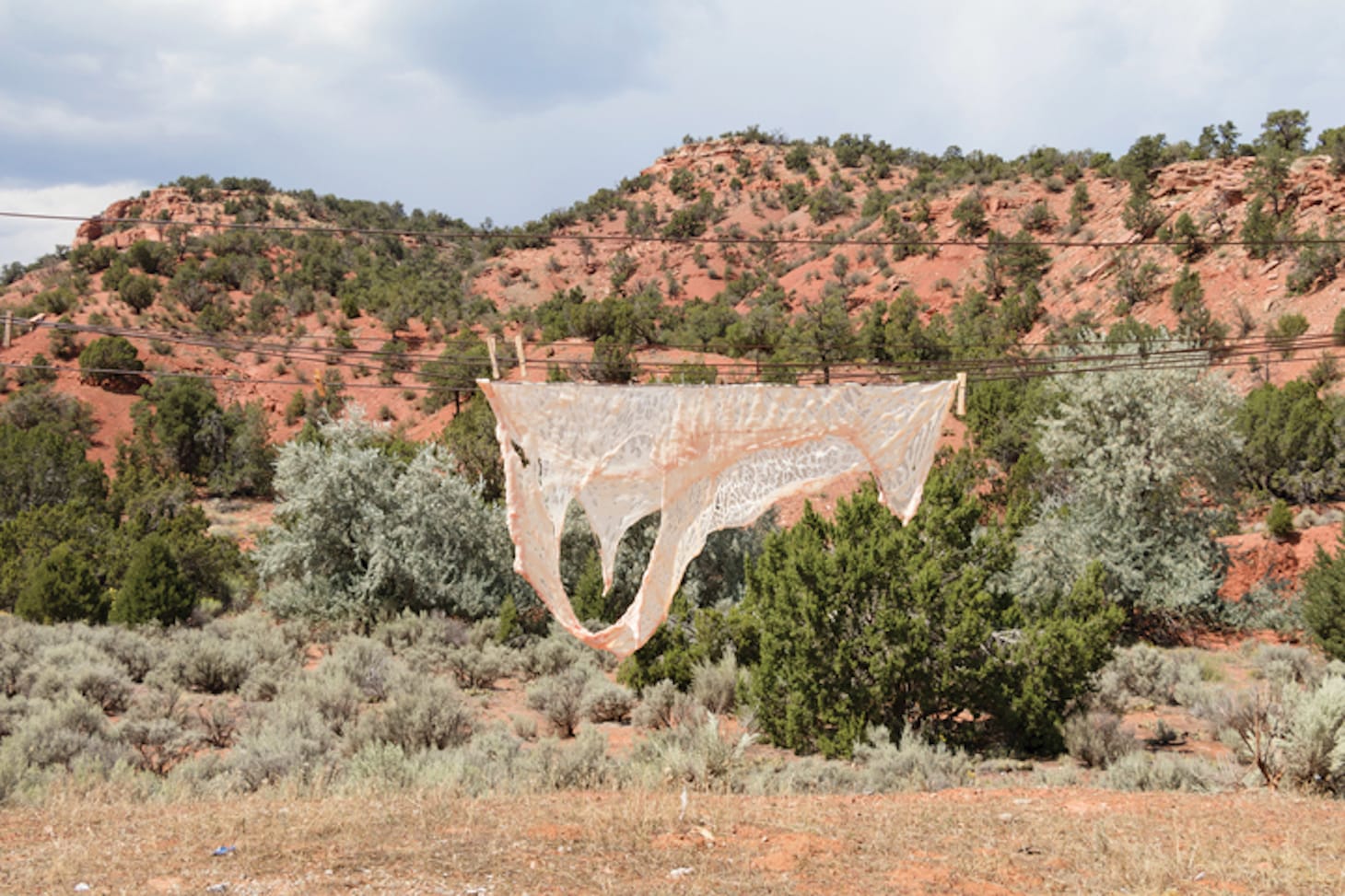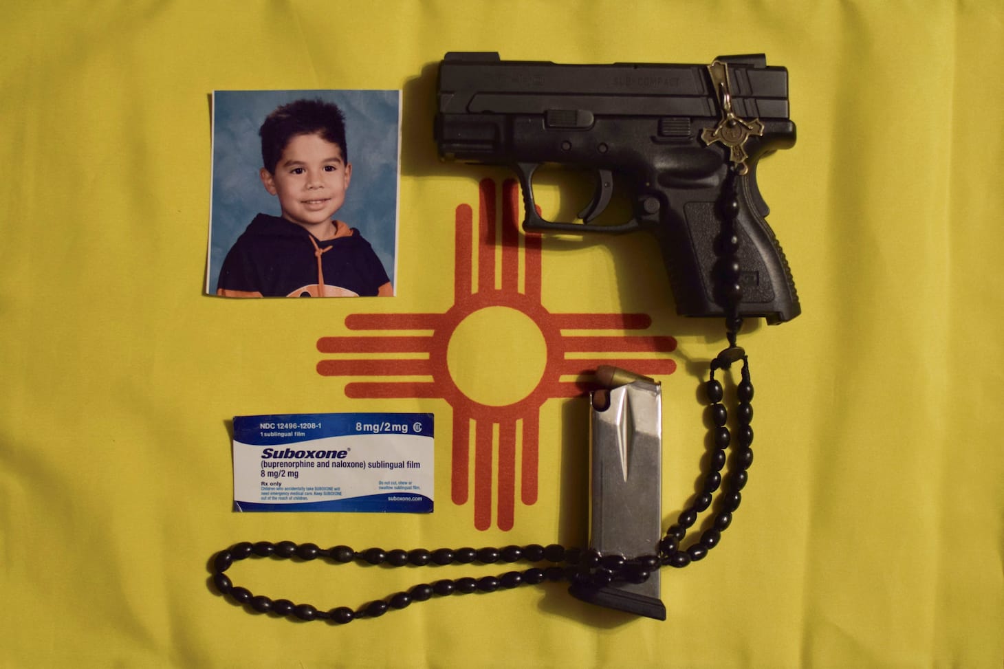 It’s undeniable that certain works in the exhibition are more contextual than others: in particular, those by the show’s three artists who use photography (Rapheal Begay, Frank Blazquez, and MK) each of whom confront the viewer with arresting images and iconography. The photographs by Begay depict scenes from the Navajo Nation, straddling the New Mexico–Arizona border. In “Rez-Dog,” a tawny shorthair with its teeth bared looms over a carcass. The animal’s tail is tucked deep between his legs, and you can count his ribs. Blazquez’s photo montage, “SOS En ABQ, My New Mexican Signifiers,” functions as a visual flashpoint for our most challenging cultural, economic, and political issues — a handgun, a rosary, Suboxone, and a wallet-sized photo of a child’s face overlay the sunny yellow cloth of the state flag, encircling a blood-red Zia.