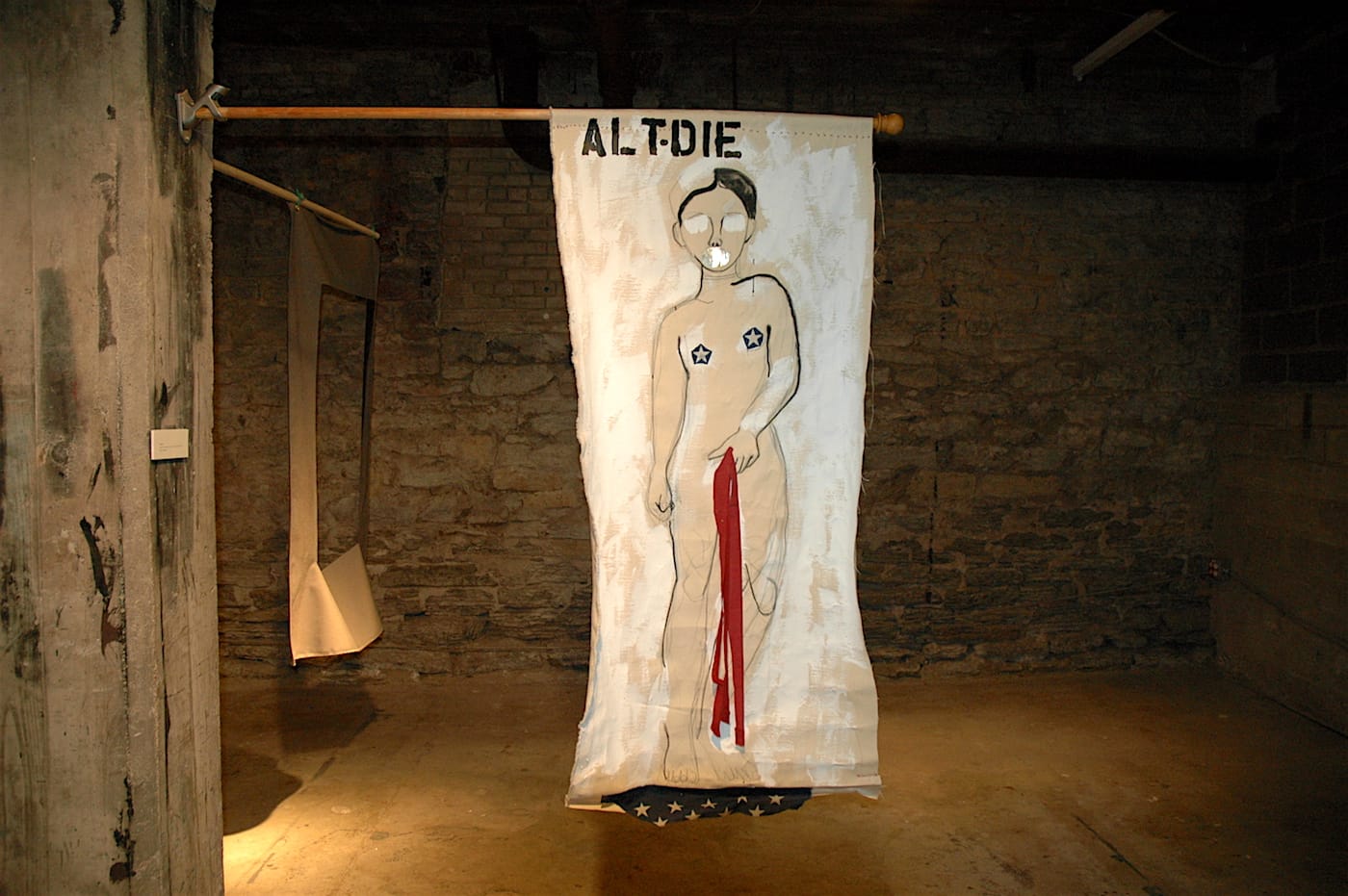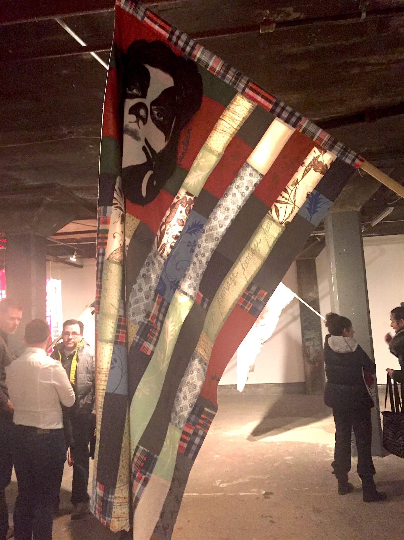 Channy Leaneagh’s participation in this exhibition was one of the things that intrigued me about it initially, because I’m a huge fan of the synthpop band Poliça, for whom she is the lead singer, and hadn’t been aware that she was a visual artist too. Like other flags in this exhibit, this piece reverberates raw emotion. With the American flag’s red stripe standing in for menstrual blood, the stars ripped at the female’s feet and dotting her nipples, the piece acts as a battle cry tuned to a female pitch. The “Alt-Die” title adds a nice mic-drop touch.