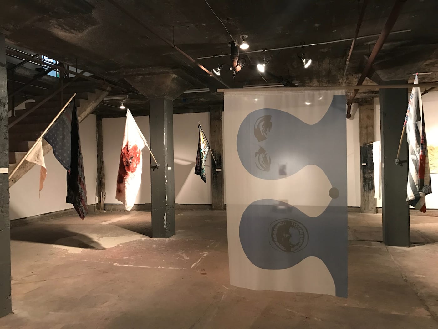 MINNEAPOLIS — Amid fury and despair over Donald Trump’s presidency, curators Alexa Horochowski and Crystal Quinn asked 13 artists to create their own flags. The only requirement was that they measure three by five feet, “the size of a standard American flag,” as Horochowski put it. The 14 flags (Horochowski and Quinn each also designed one) are on view in the exhibition Bleed&Burn: Catalytic Flag Making at the Soap Factory in Minneapolis, but they will eventually be burned, after the show closes, and documented in a book put out by Beyond Repair. For now, I stopped by the gallery to check out the flags. Here are a few of my favorites.