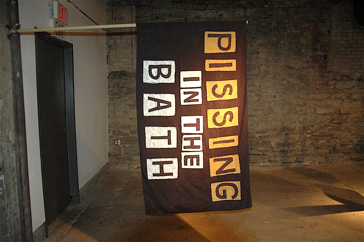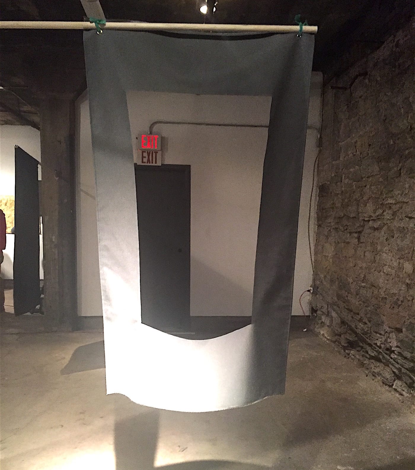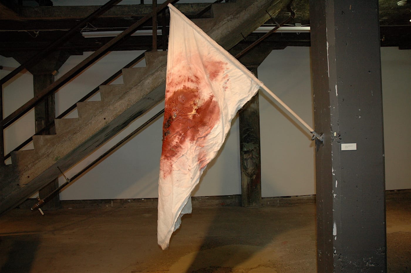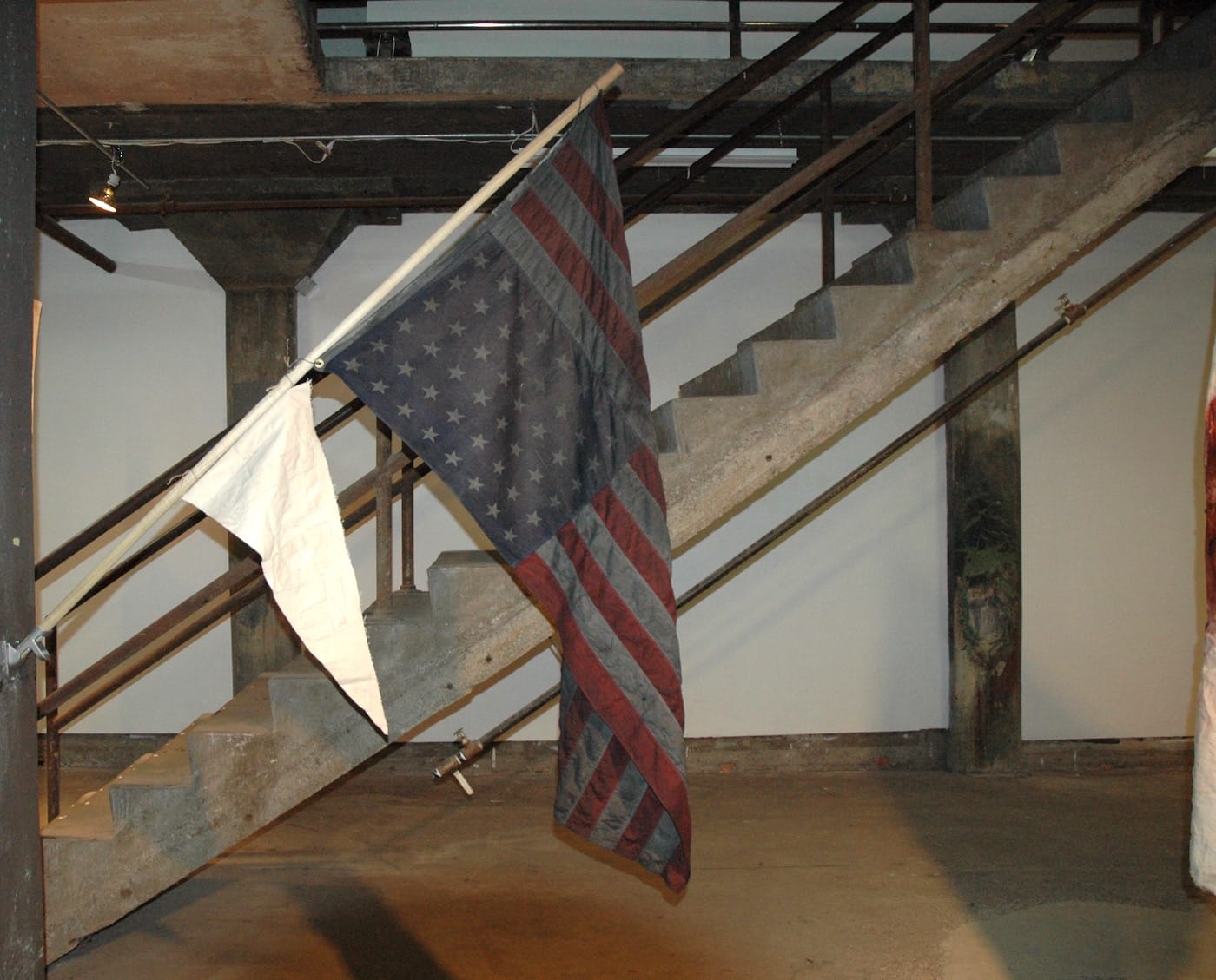 Credit goes to the curators for the placement of this flag, which offers a window to the exit sign. The flag hints at an emptiness to American patriotism, while also suggesting that there’s an escape if we look past the flag.