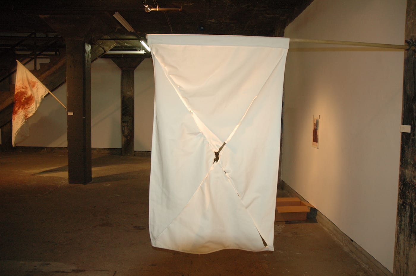 Like several other artists in the show, Sarah Petersen takes on the white flag motif, in this case with a suggestion of the outline of the confederate flag. This flag looks as if it were slashed, despite the surrender, but there’s a lovely light that seeps in through the cracks, suggesting hope.