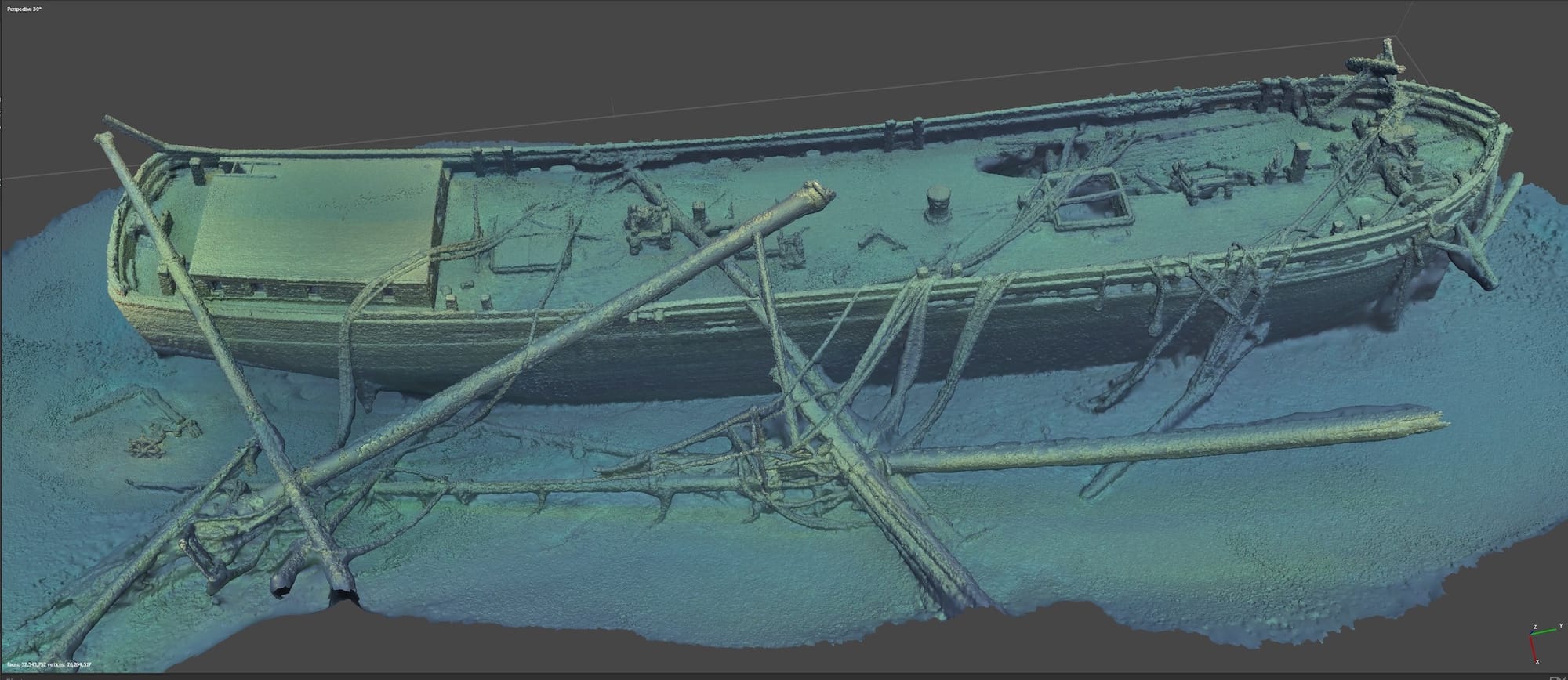 Baillod and Jaeck found the wreck by connecting a custom-built underwater tow to the bottom of their boat’s hull. Hanging below the boat, the tow emitted a low-frequency sonar scan to produce a three-dimensional map of the lake floor. On their second day of surveying the terrain, they spotted a “smudge,” which was revealed to be the vessel resting beneath 270 feet of water upon additional scanning at a slower speed. The site of the schooner was almost exactly where Captain Higgins had first reported the vessel’s water demise 142 years earlier.