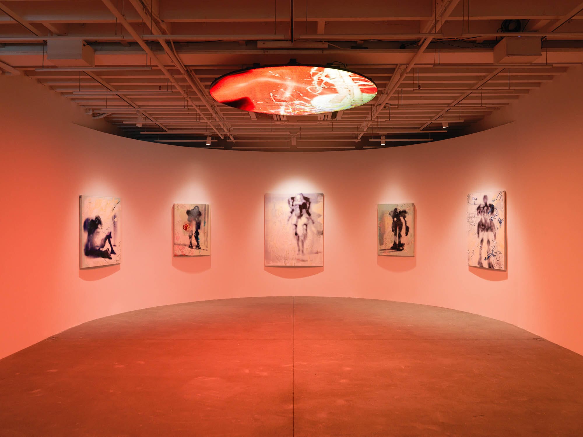 There’s a hypnotic quality to the small, circular display screens placed throughout Rachel Rossin’s latest exhibition. Covered in thick cast-glass lenses and mounted on metal clamps, they evoke submarine portholes peering out into an unknown abyss — a shapeshifting matrix of animated forms, biomorphic characters, and infrared imagery born of Rossin’s experiments with brain-computer interfaces. The objects reference the practice of scrying, a method of divination dating as far back as Ancient Babylonia that involves the perception of signs and symbols in reflective surfaces and other mediums. Installed centrally on the ceiling, Rossin’s lenticular LED screen work "The Maw Of" (2022) steeps the quasi-abstract paintings on view in an eerie warm light; the show is a haunting meditation on the future of technology. —VD